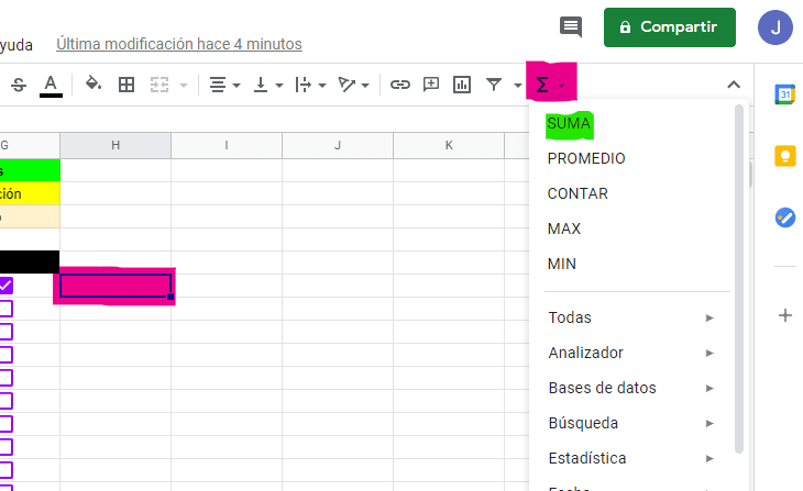 Nos vamos al final de nuestras columnas y le damos clic a la opción de funciones y después Suma