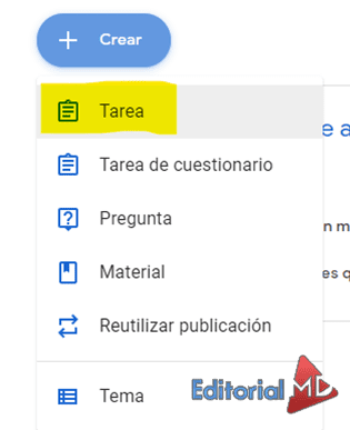 Nos vamos a la parte donde dice trabajo de clase > crear > Tarea