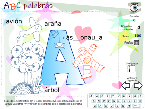Vocabulario básico fonético, visual e interactivo, asociado al abecedario. Fuga de letras configurable para completado. Para cada letra del abecedario se proponen una serie de palabras (con sus imágenes asociadas) que comienzan con esa letra. La aplicación se puede configurar fácilmente para que las palabras muestres sólo su primera letra, sólo las vocales, sólo las consonantes, etc…así como para que se puedan presentar con mayúsculas o minúsculas. Completado de letras asistido con corrección y estadísticas instantáneas.