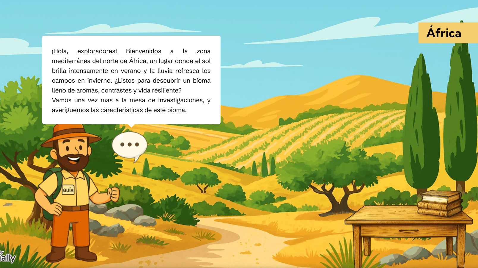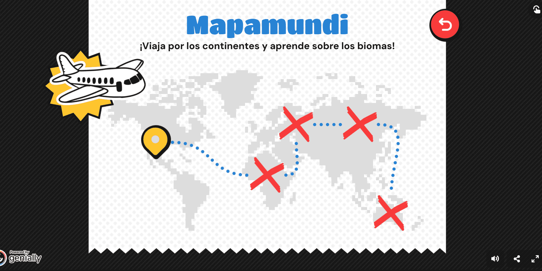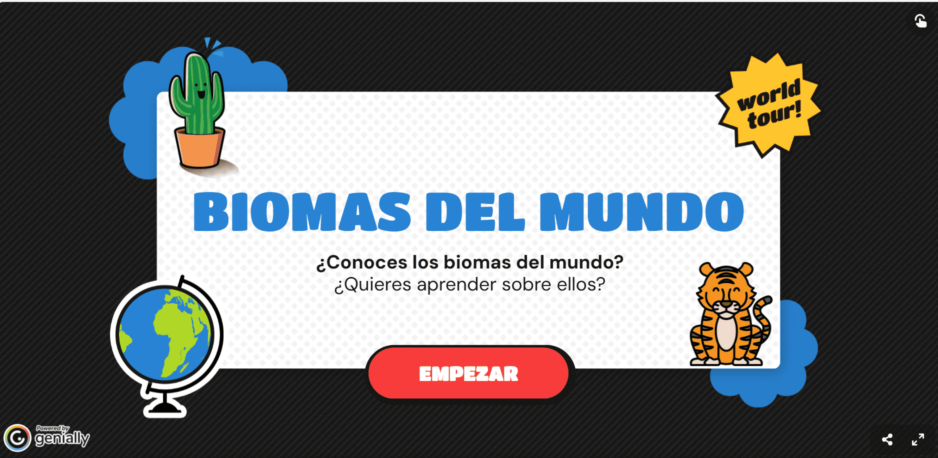 Banner colorido que dice "Biomas del mundo". Incluye un cactus, un tigre, un globo terráqueo y un botón rojo que dice "Empezar". También pregunta si conoces y quieres aprender sobre los biomas del mundo.