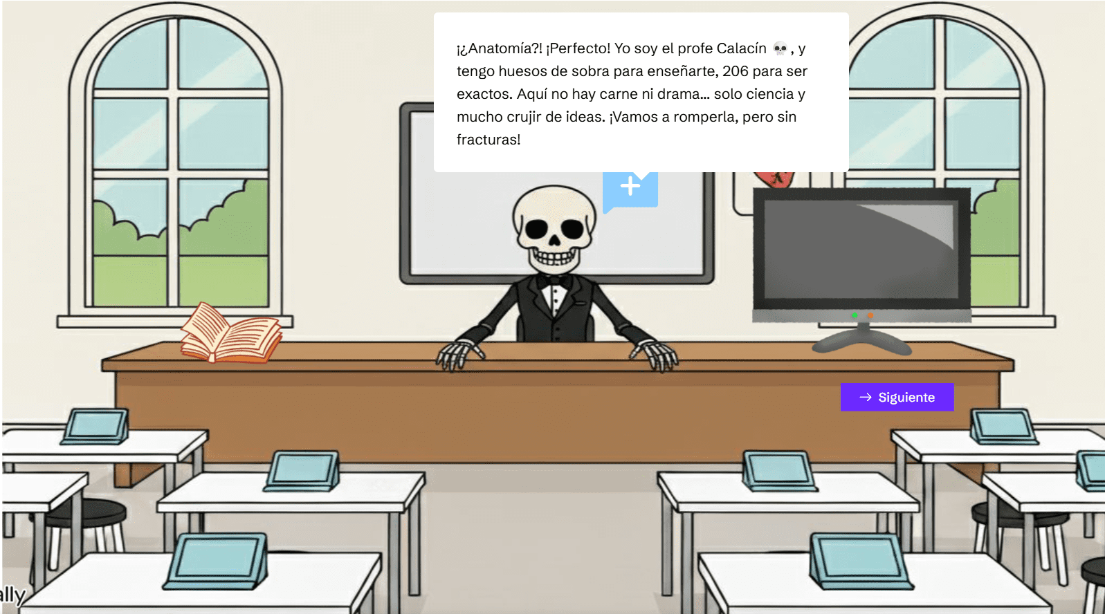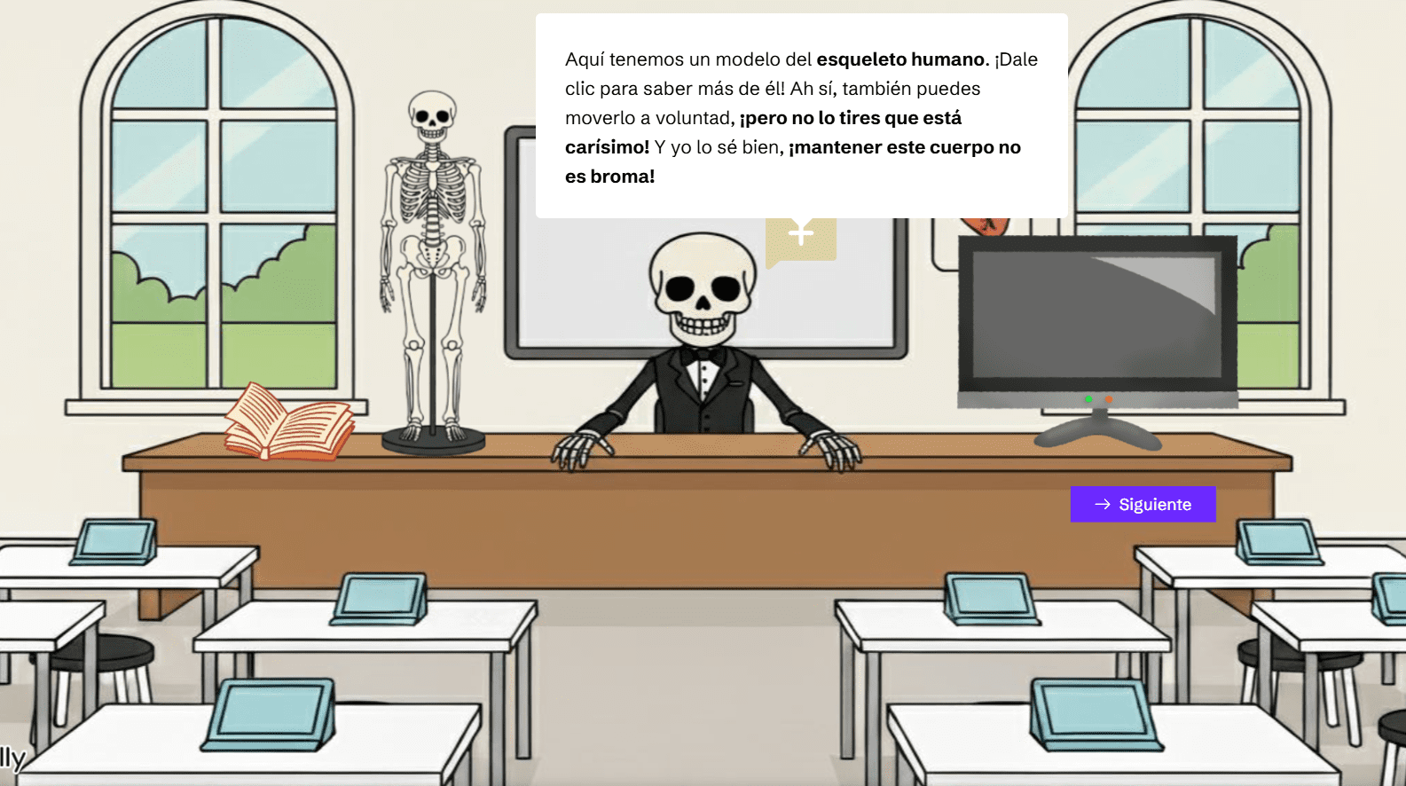 Un esqueleto con traje está de pie detrás de un escritorio en un aula moderna. Hay escritorios con tabletas, una pizarra, una ventana y un comentario en español sobre enseñar anatomía sin fracturas.