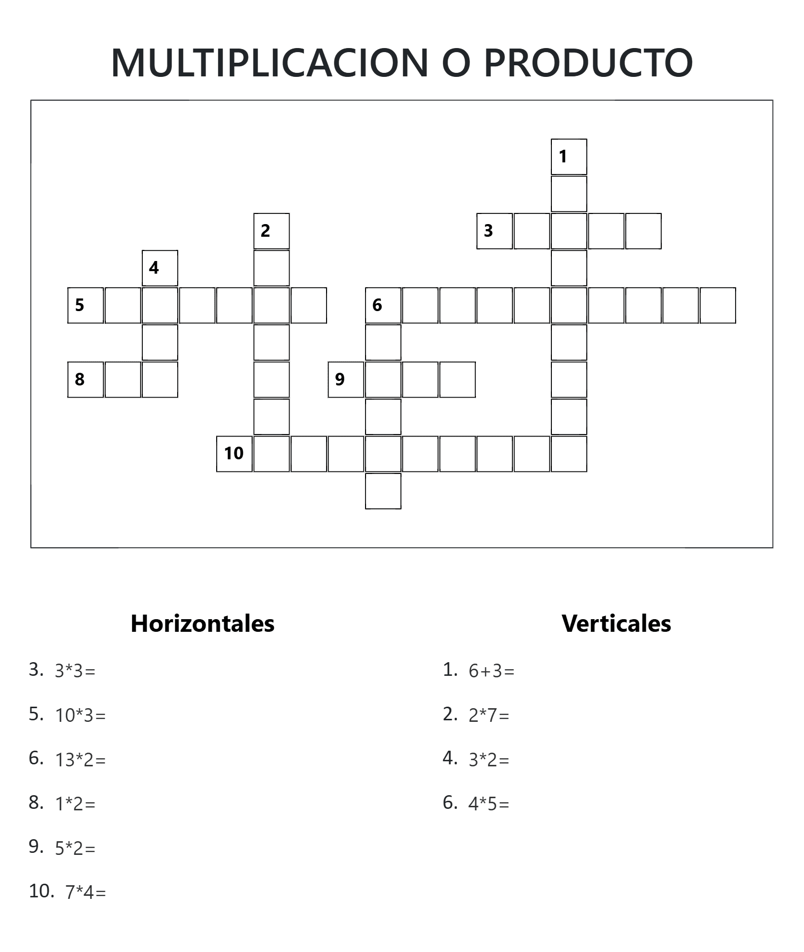 Un crucigrama de multiplicación en español titulado "MULTIPLICACION O PRODUCTO". Tiene una cuadrícula con pistas numeradas para respuestas horizontales y verticales, y problemas de multiplicación listados abajo para cada pista.