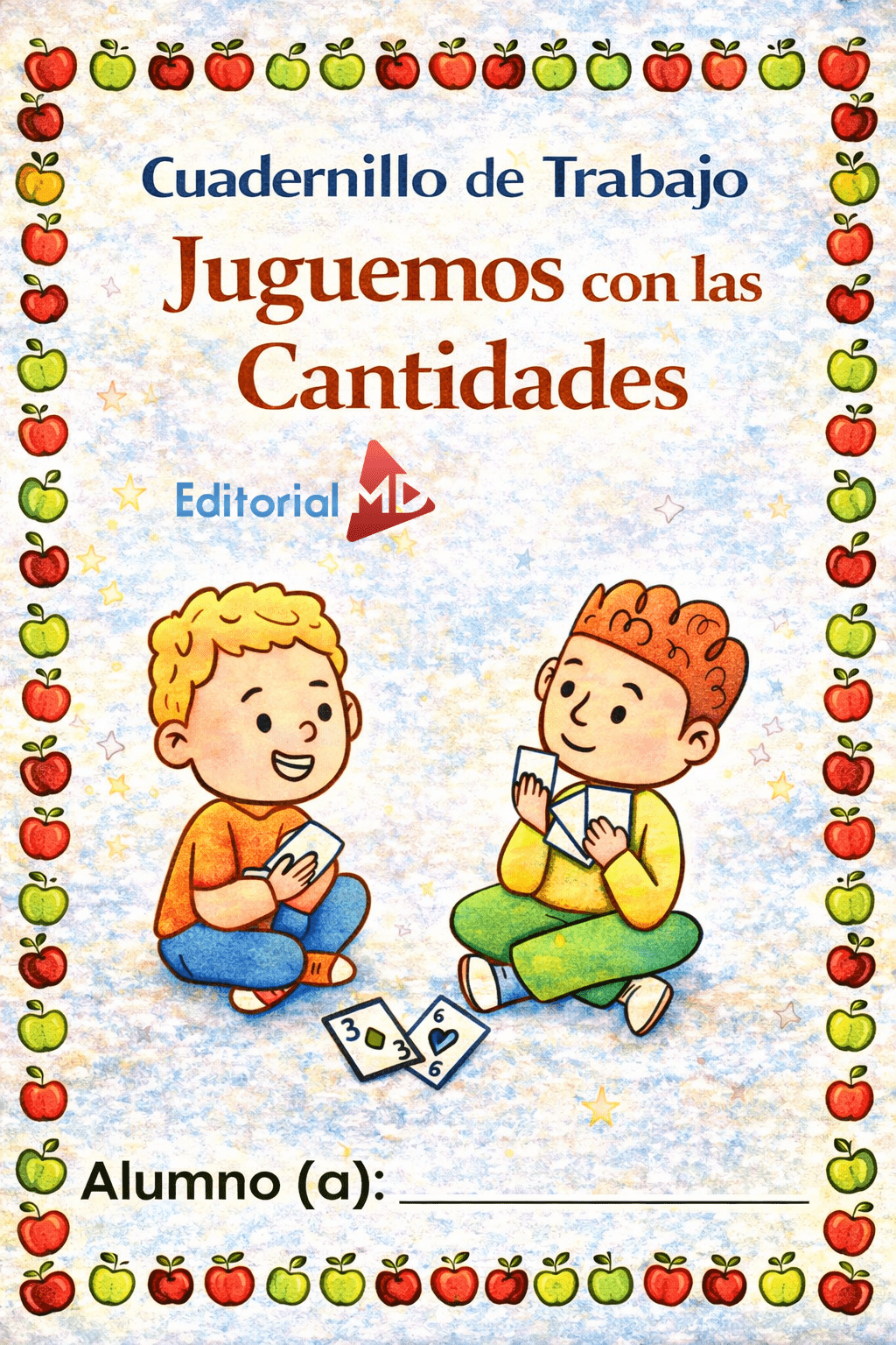 La portada del Cuadernillo de Trabajo Juguemos con las Cantidades muestra a dos niños sonrientes sentados en el suelo con tarjetas numeradas. El colorido borde tiene manzanas y un espacio en blanco para el nombre del alumno.
