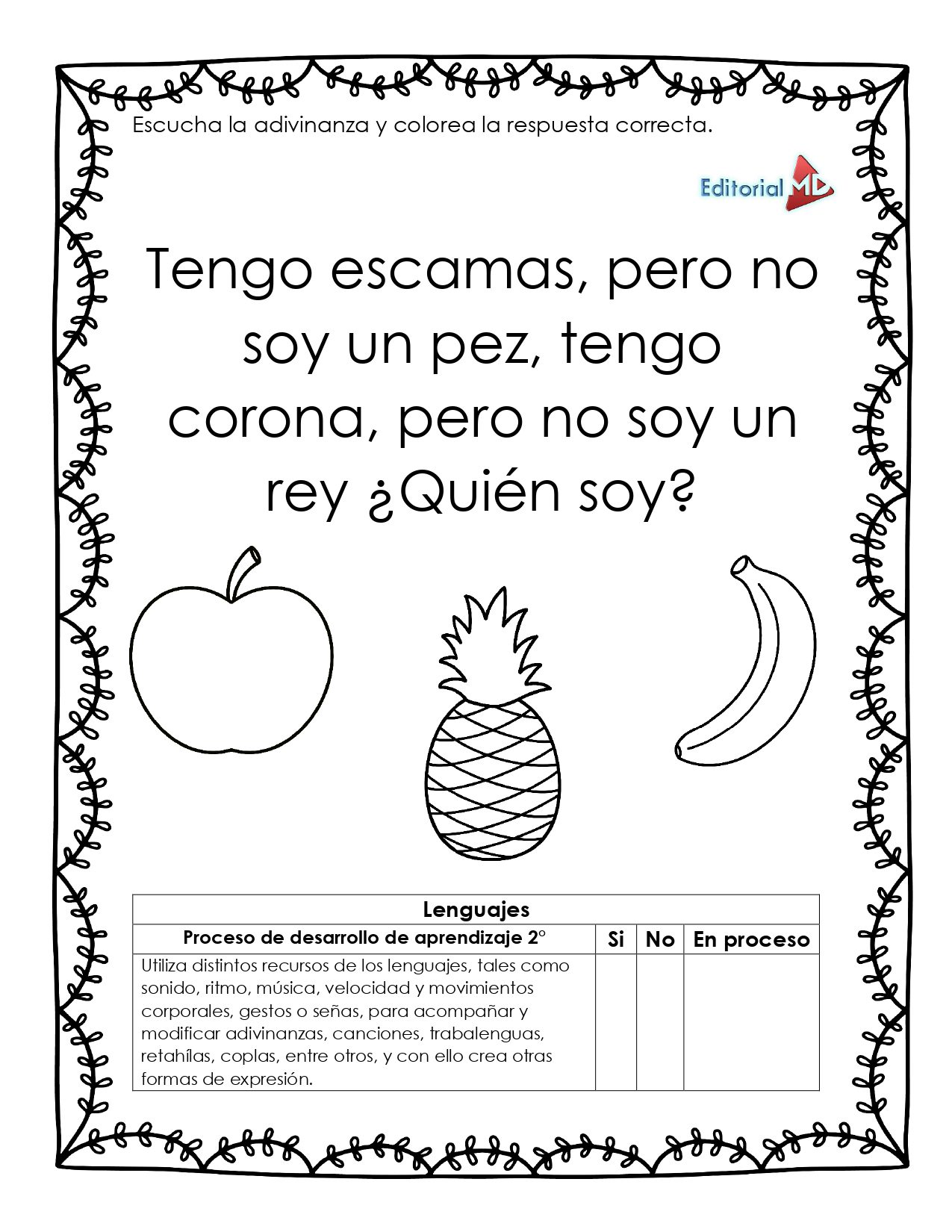 A lo largo de 17 páginas listas para imprimir, las niñas y los niños escuchan, interpretan, resuelven, inventan y representan adivinanzas relacionadas con animales, alimentos, ubicación espacial y oficios, fortaleciendo diversas formas de expresión y comunicación, alineadas principalmente con el campo formativo de Lenguajes, e integrando contenidos de Saberes y Pensamiento Científico y Ética, Naturaleza y Sociedades.