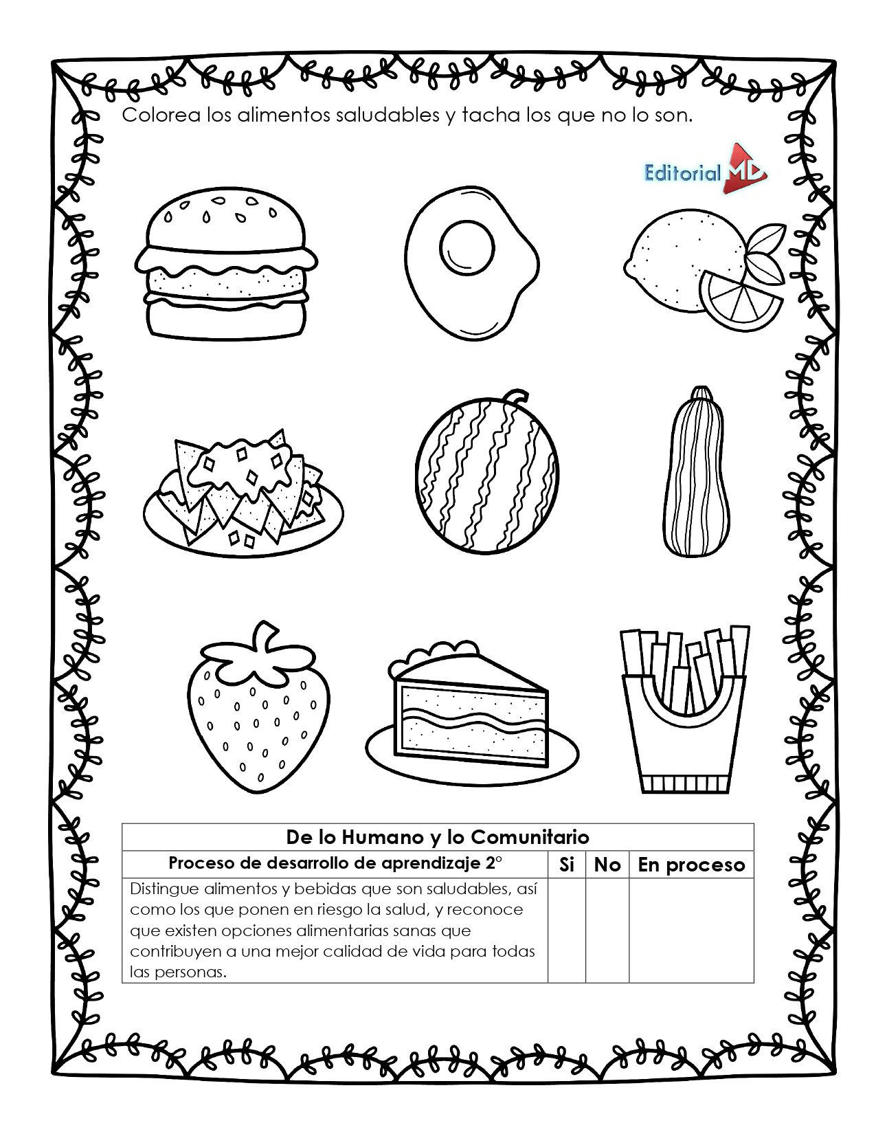 Colorear los alimentos saludables y tachar los que no lo son (pág. 9).