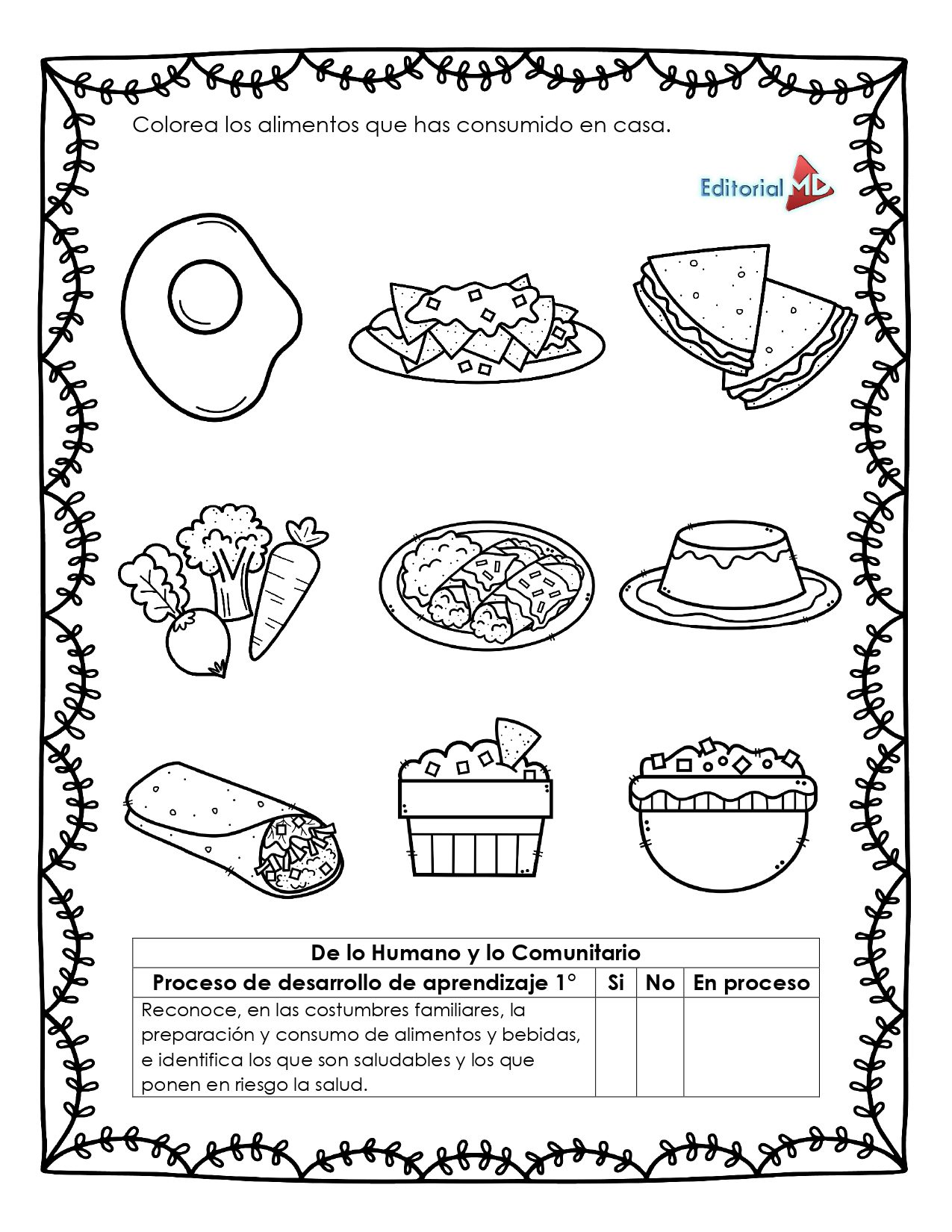 Colorear los alimentos que consumen en casa e identificar cuáles son saludables (pág. 10).