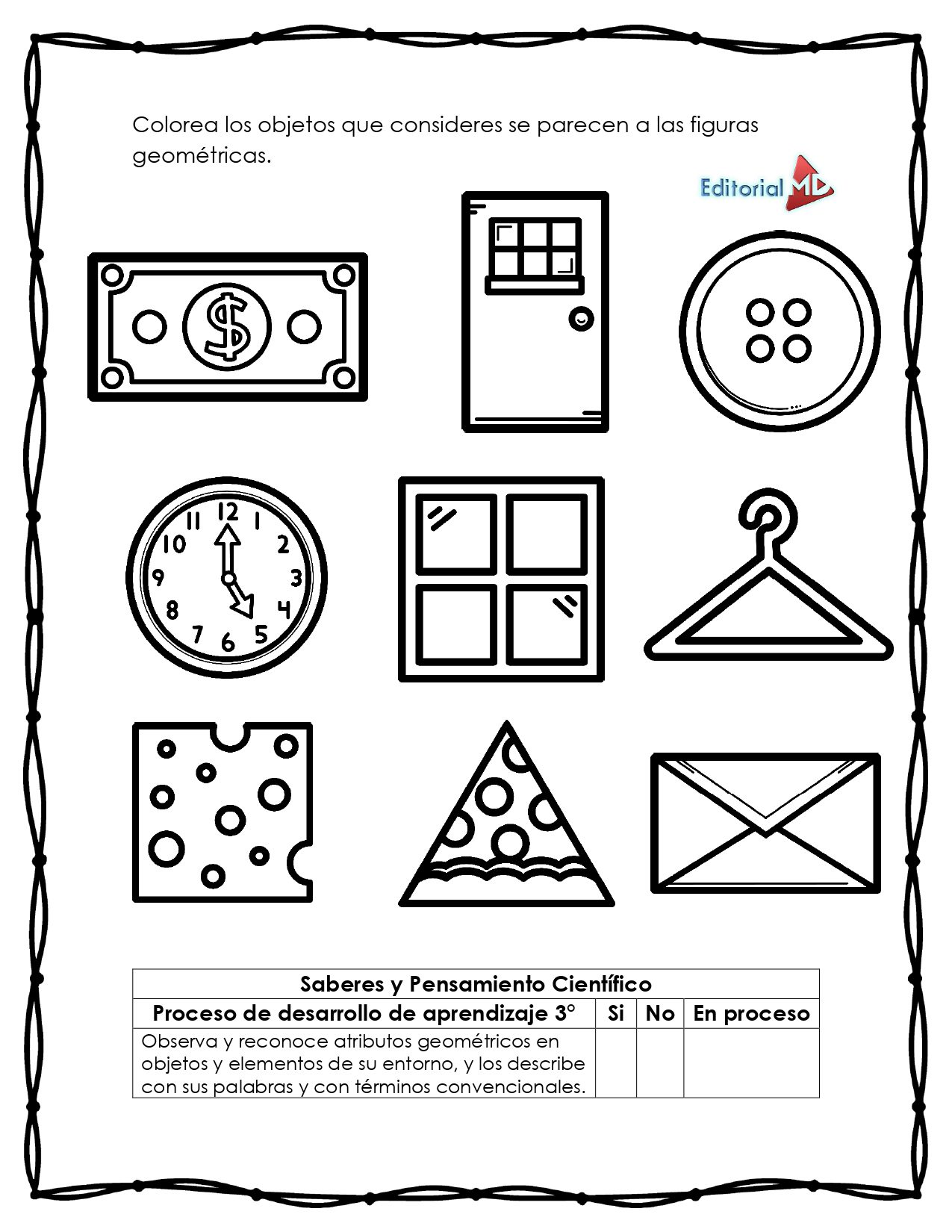 Colorear objetos del entorno que se parecen a figuras geométricas (pág. 3).