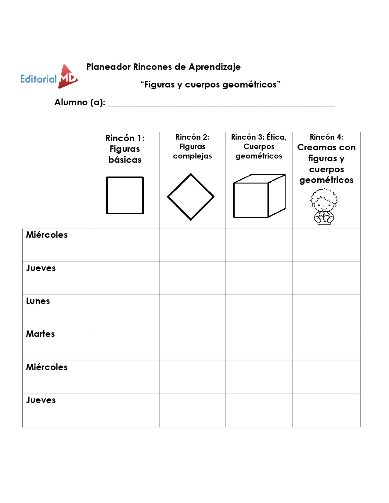 Planeador de Rincones de Aprendizaje con actividades de figuras básicas, figuras complejas, cuerpos geométricos y creación con figuras (pág. 4).