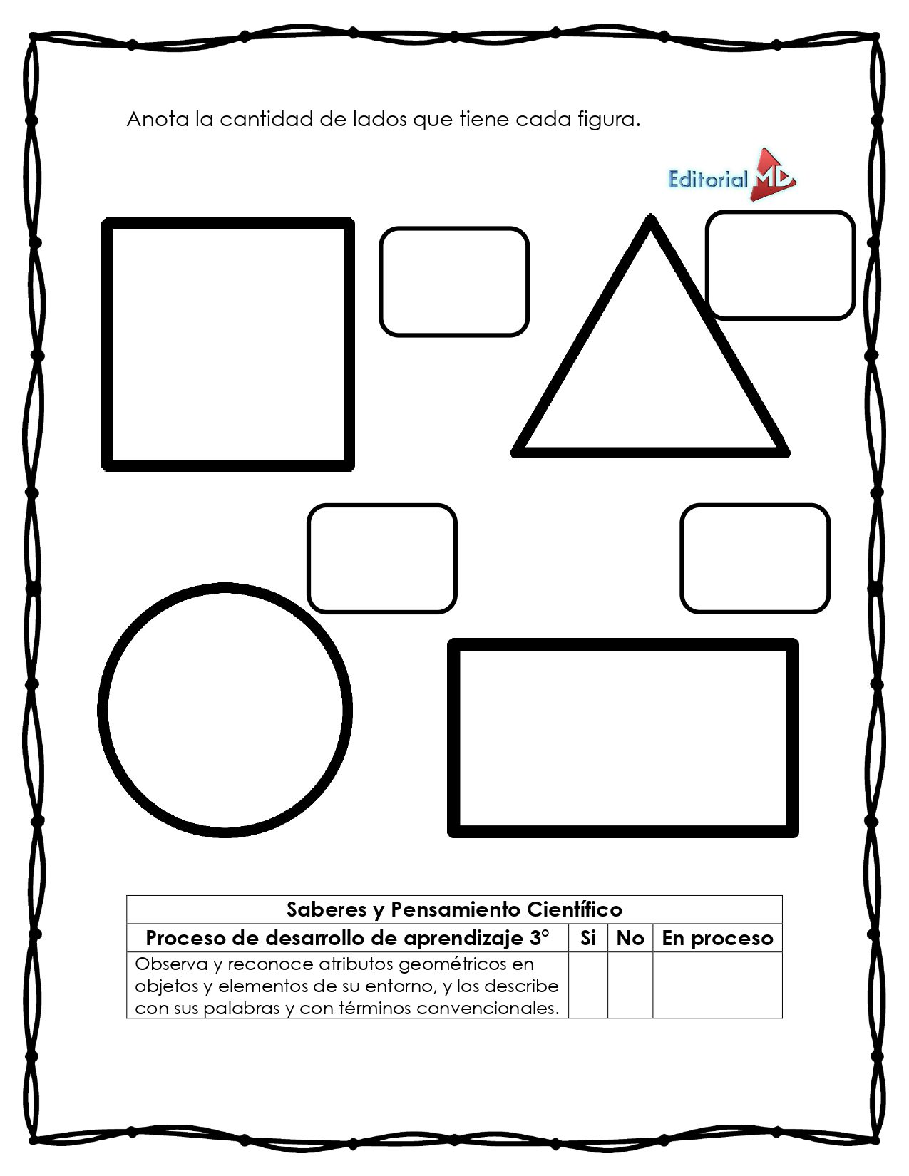 Identificar y anotar la cantidad de lados de cada figura (págs. 8 y 12).