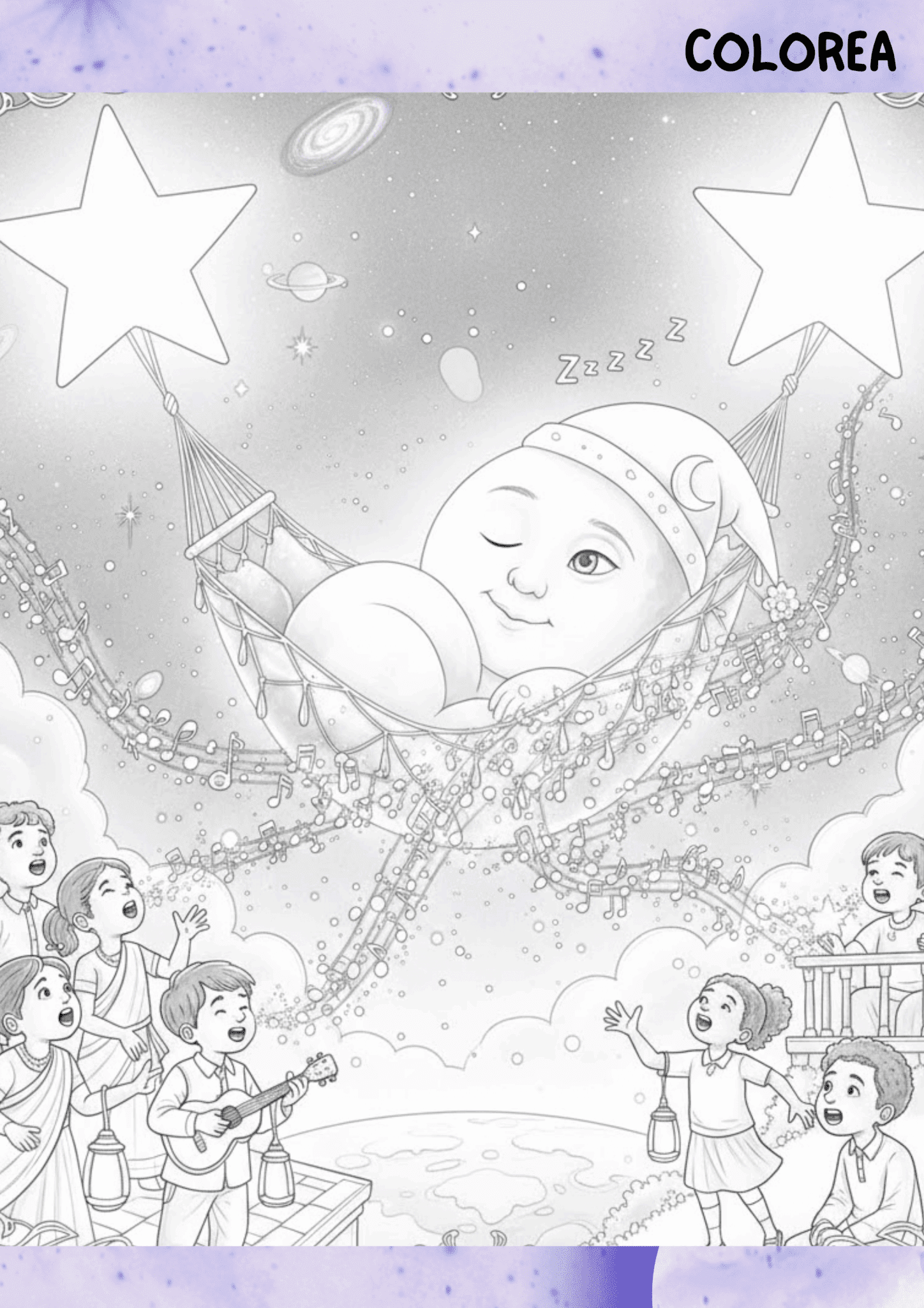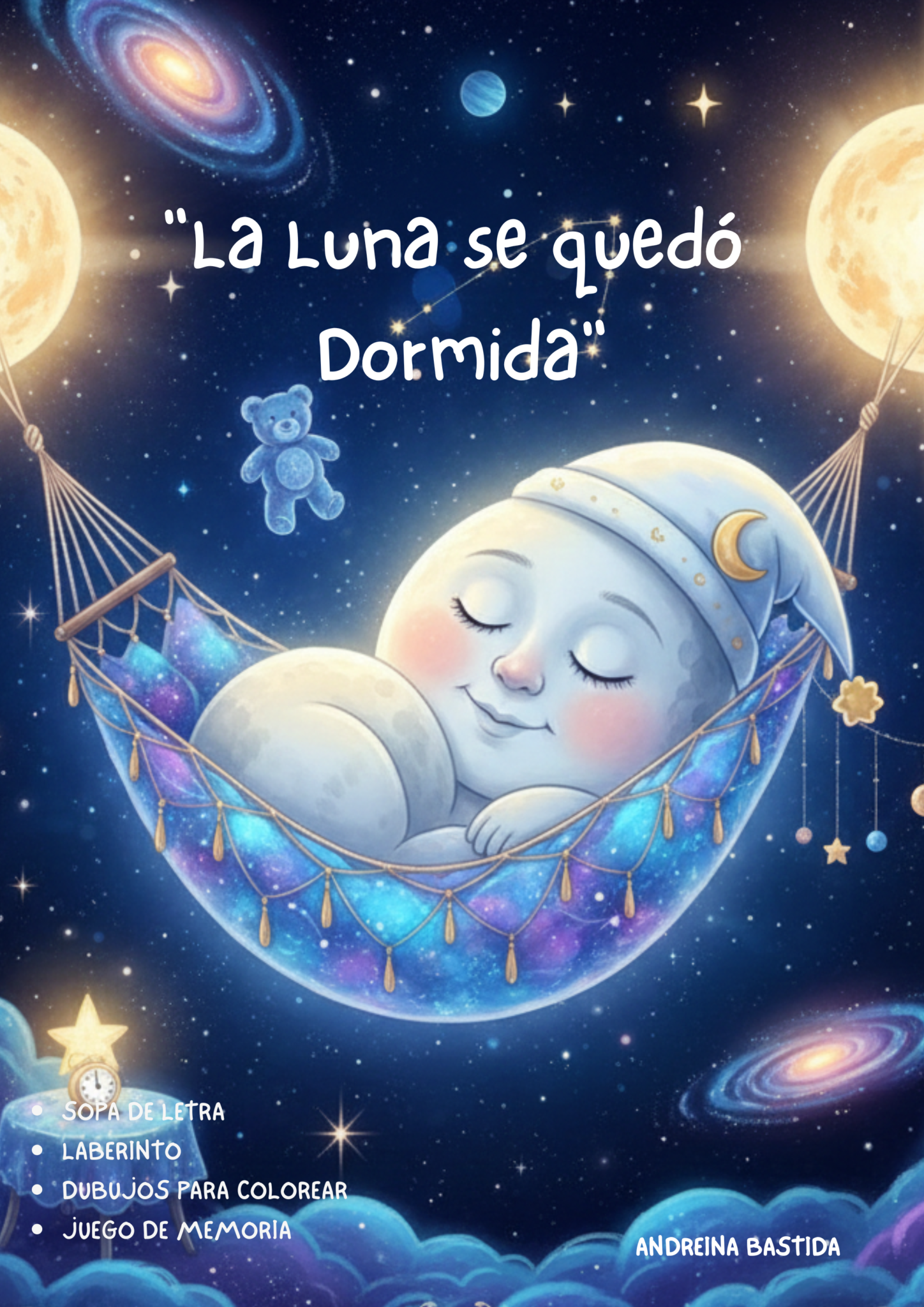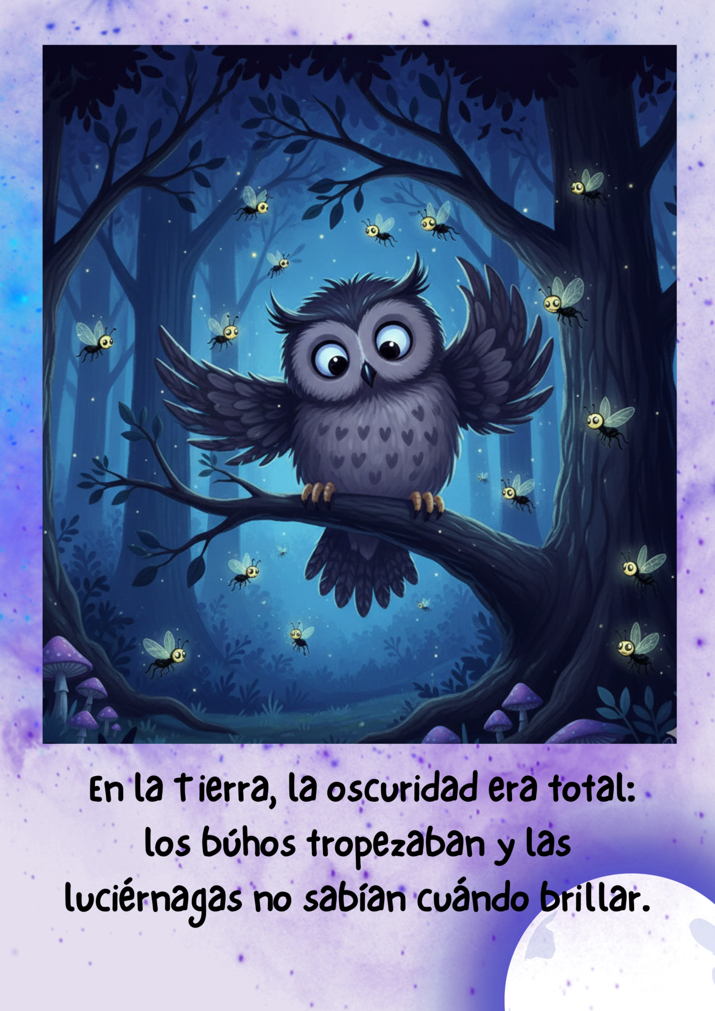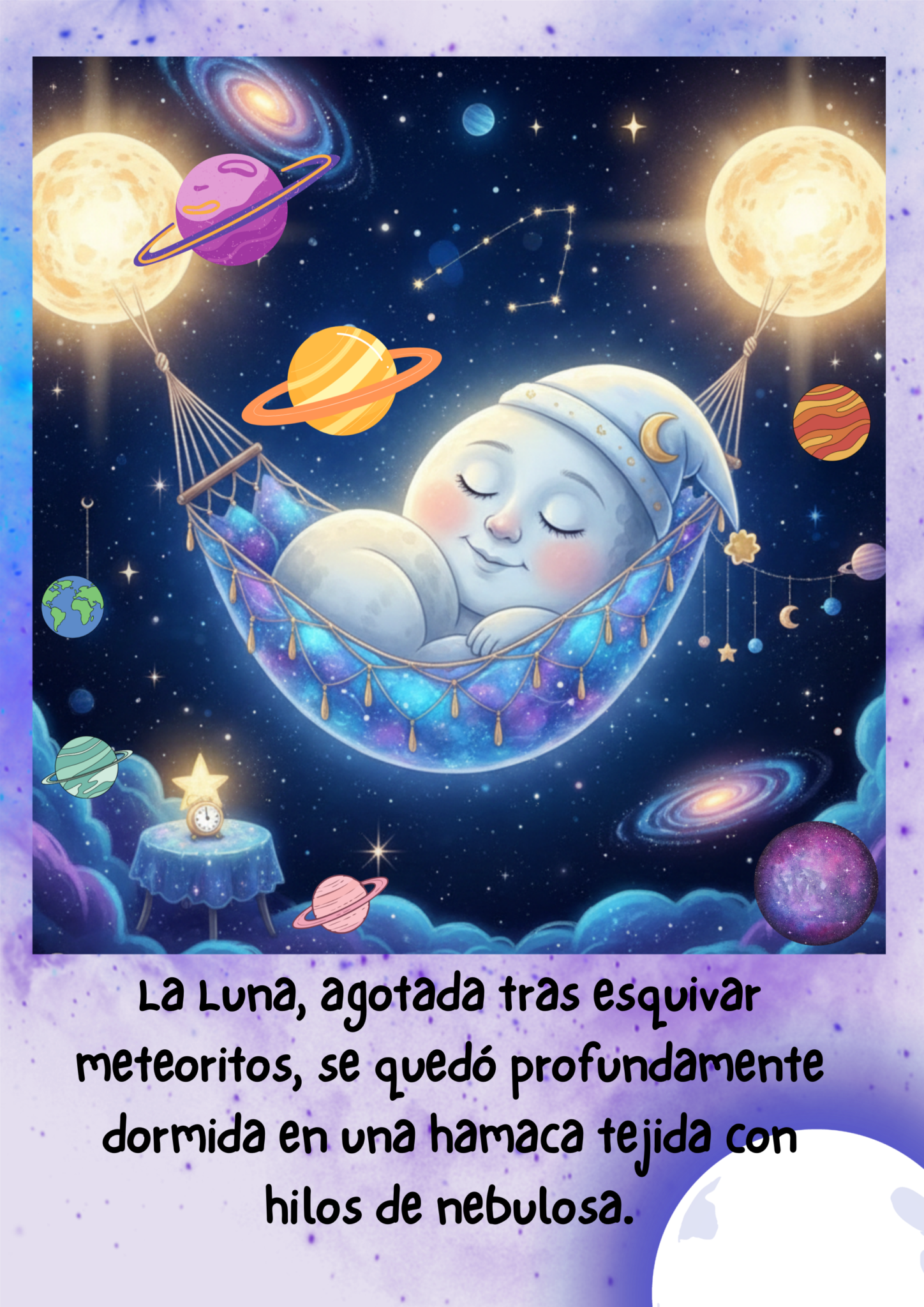 Al escuchar las voces dulces y claras de los niños, la Luna abre un ojo, bosteza (creando un arcoíris nocturno) y se estira con una gran sonrisa. Agradecida por el tierno despertar, sube a lo más alto del cielo y brilla con más fuerza que nunca, bañando todo de luz plateada. Los niños, felices por haber ayudado a su amiga, ahora sí pueden irse a dormir bajo su protección.