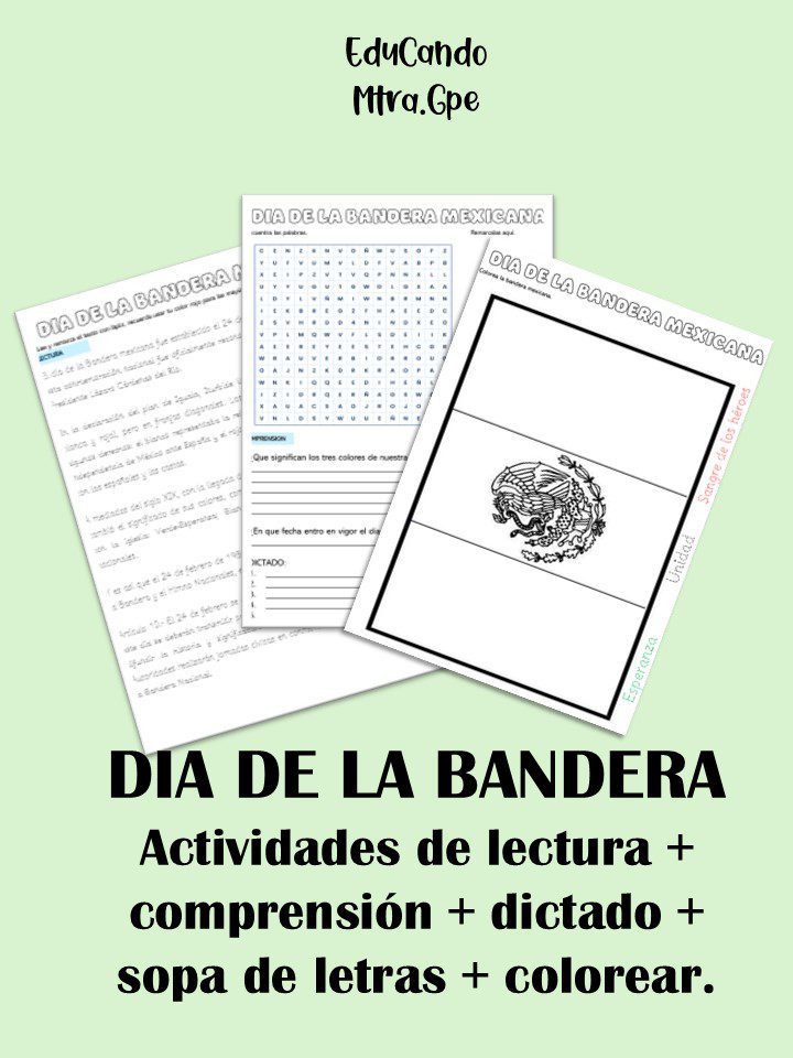 EXCELENTE MATERIAL PARA TRABAJAR LA HISTORIA DEL DIA DE LA BANDERA MEXICANA INCLUYE LECTURA + COMPRENSION LECTORA+ ESCRITURA+ DICTADO+ SOPA DE LETRAS Y LA BANDERA DE COLOREAR. UN MATERIAL COMPLETO PARA REFORZAR AREAS DE COMPRENSION LECTORA Y ESCRITURA CON UN TEMA MUY IMPORTANTE COMO EL DIA DE LA BANDERA EN MEXICO