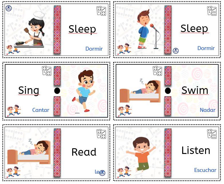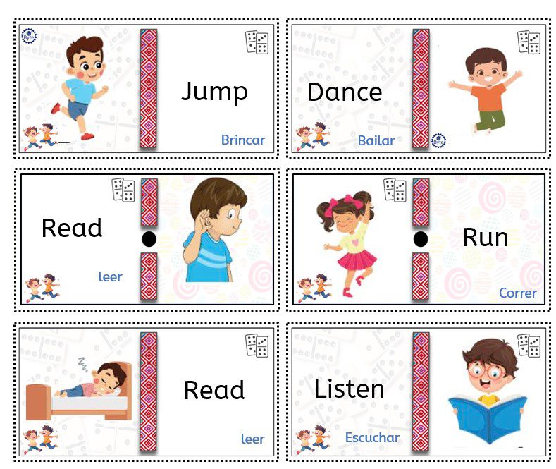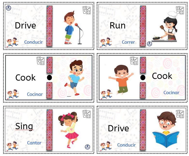 El Dominó de Verbos en Inglés es un recurso didáctico diseñado para que el aprendizaje sea una experiencia divertida y significativa. Cada ficha contiene un verbo en inglés acompañado de su traducción o una ilustración sencilla, lo que permite relacionar el concepto de manera visual y práctica.