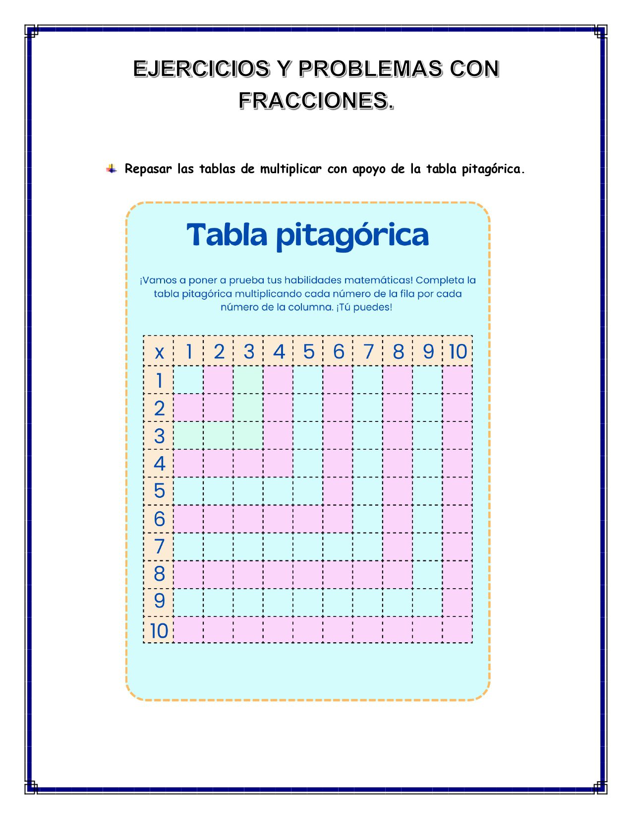 - Repaso de las tablas de multiplicar con apoyo de la tabla pitagórica, ya que las multiplicaciones son esenciales el momento de realizar operaciones con fracciones.