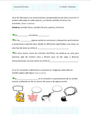 El contenido de la Evaluación Final Tercer Grado de Primaria es completamente modificable. Es un material excelente y muy completo que contiene la evaluación de las materias: español, matemática y ciencias naturales. Por su diseño y tipo de documento permitirá realizar el proceso evaluación a los estudiantes de manera sencilla, efectiva y con una impecable presentación.