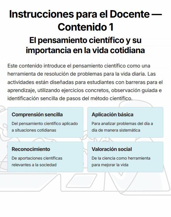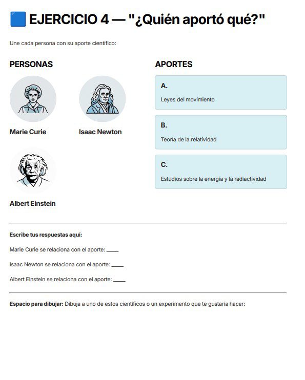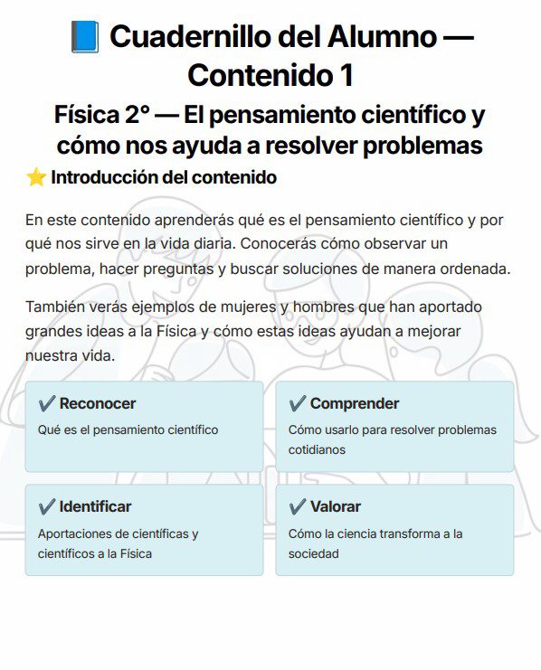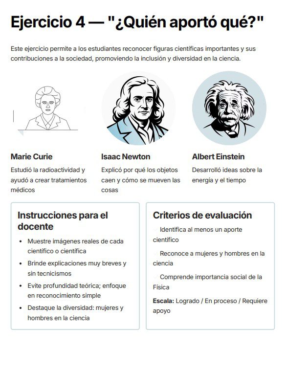 El cuadernillo incluye 4 actividades didácticas listas para imprimir por cada contenido del programa, totalmente adaptadas, visuales y de baja demanda textual. Estas actividades permiten a los estudiantes comprender conceptos fundamentales de la Física —como fuerza, movimiento, energía, materia, electricidad, magnetismo y fenómenos naturales— mediante ejercicios claros, graduales y accesibles para diversos tipos de barreras.