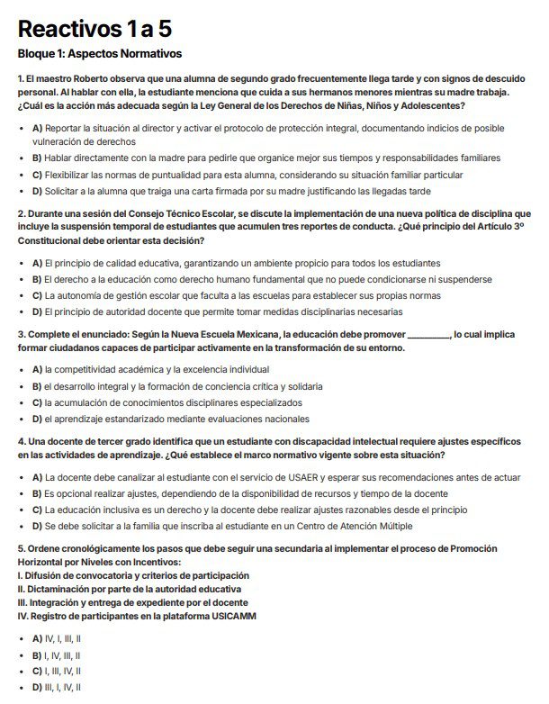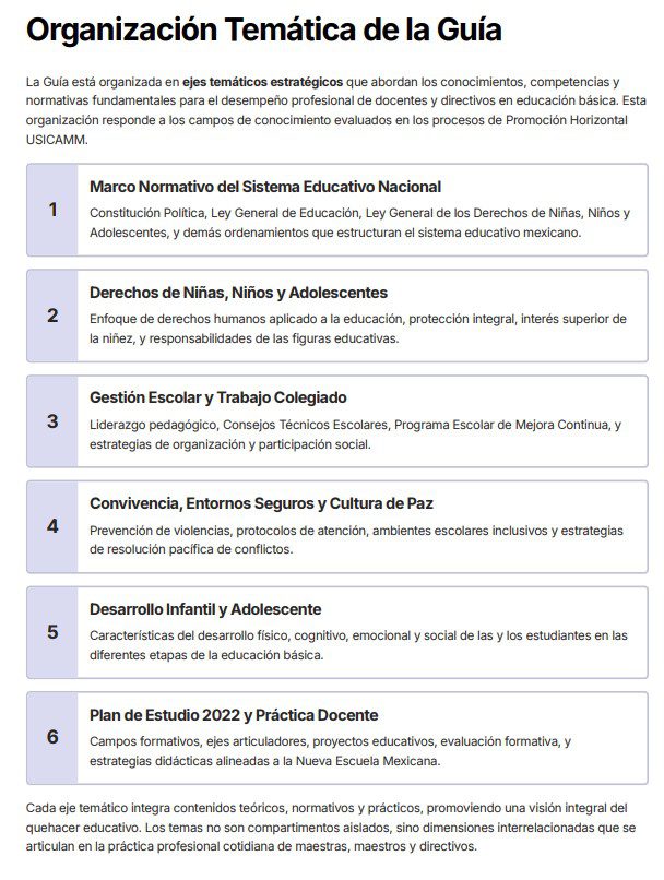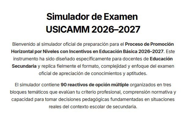 Prepárate de manera sólida, estratégica y alineada a USICAMM para el Proceso de Promoción Horizontal 2026–2027. El material se basa en los documentos normativos y pedagógicos oficiales y se organiza en recursos que integran resúmenes didácticos, presentaciones con conceptos clave y reactivos tipo examen basados en situaciones reales del aula y la escuela secundaria. 👉 Incluye un simulador de 90 reactivos con retroalimentación, ideal para un estudio estructurado, progresivo y enfocado en la toma de decisiones pedagógicas y de gestión que evalúa USICAMM.