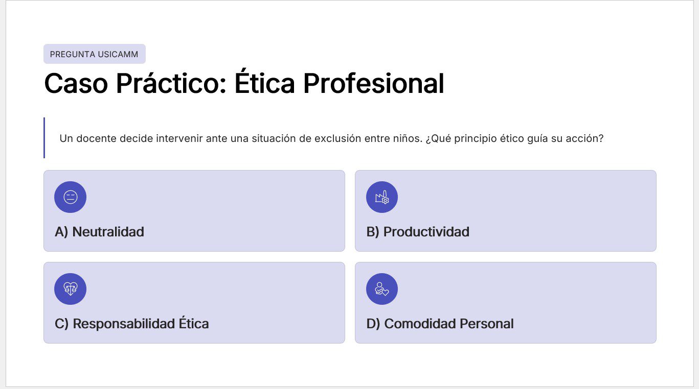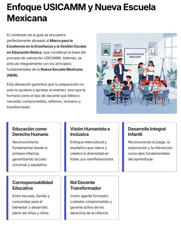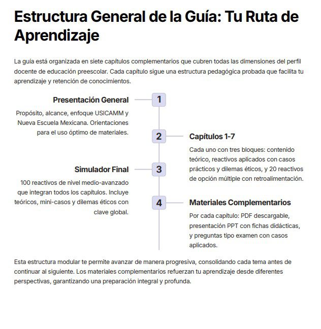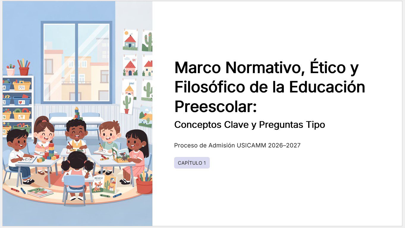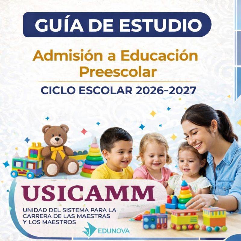 Prepárate con seguridad para el Proceso de Admisión a Educación Preescolar USICAMM 2026–2027. Esta Guía de Estudio desarrollada por expertos en el proceso de admisión está organizada por capítulos alineados al Marco para la Excelencia en Educación Básica y al enfoque de la Nueva Escuela Mexicana, considerando las características propias de la educación en la primera infancia. Cada capítulo incluye un documento en PDF y una presentación en PowerPoint con fichas didácticas, esquemas visuales y preguntas tipo USICAMM, lo que facilita un estudio gradual, estructurado y práctico. 👉 Incluye más de 350 reactivos tipo USICAMM, mini-casos pedagógicos, dilemas éticos y ejercicios de autoevaluación enfocados en educación preescolar.