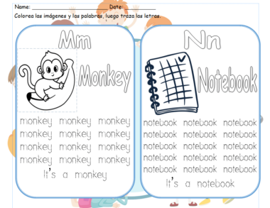 Guias del abecedario en inglés para aprender vocabulario básico, colorear y practicar la motricidad fina en estudiantes de preescolar y primer grado.