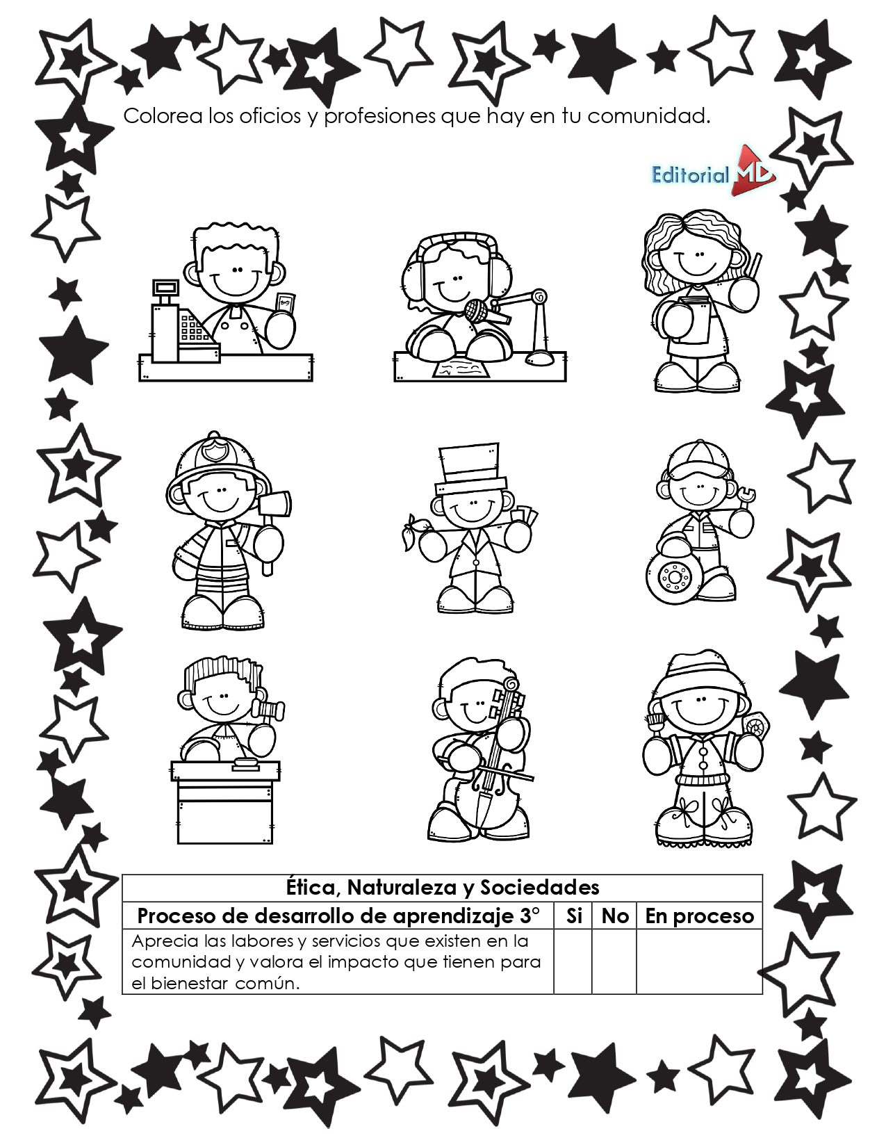 Identificación y coloreado de oficios y profesiones presentes en la comunidad (pág. 3).