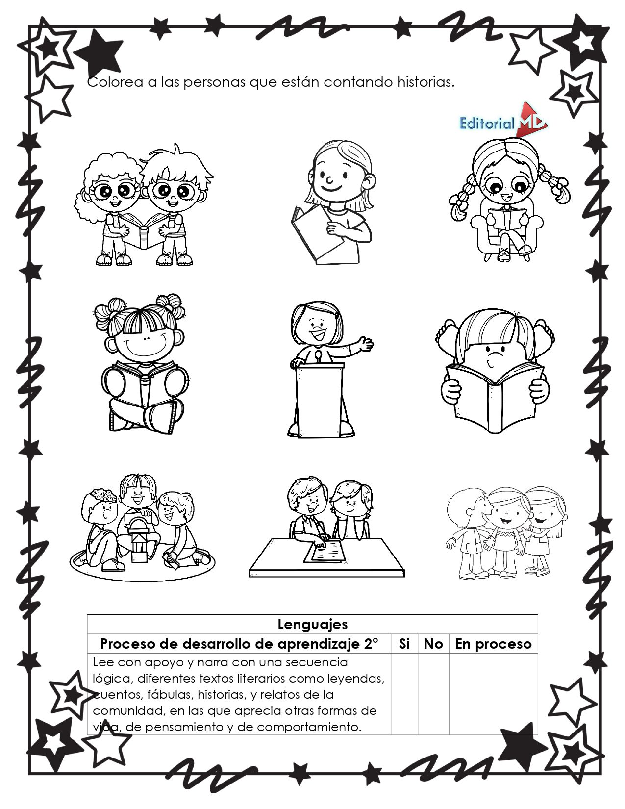Colorear actitudes adecuadas al escuchar o contar historias, promoviendo la cultura de paz (pág. 6).