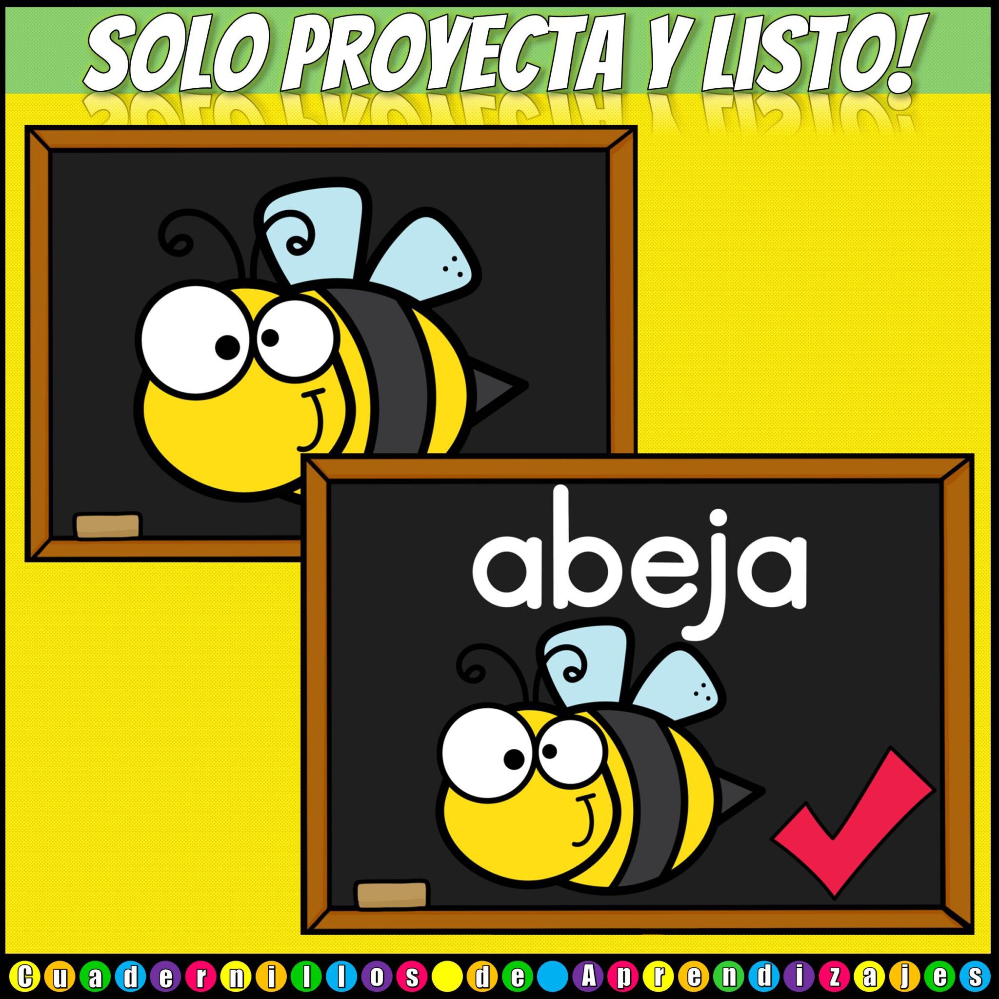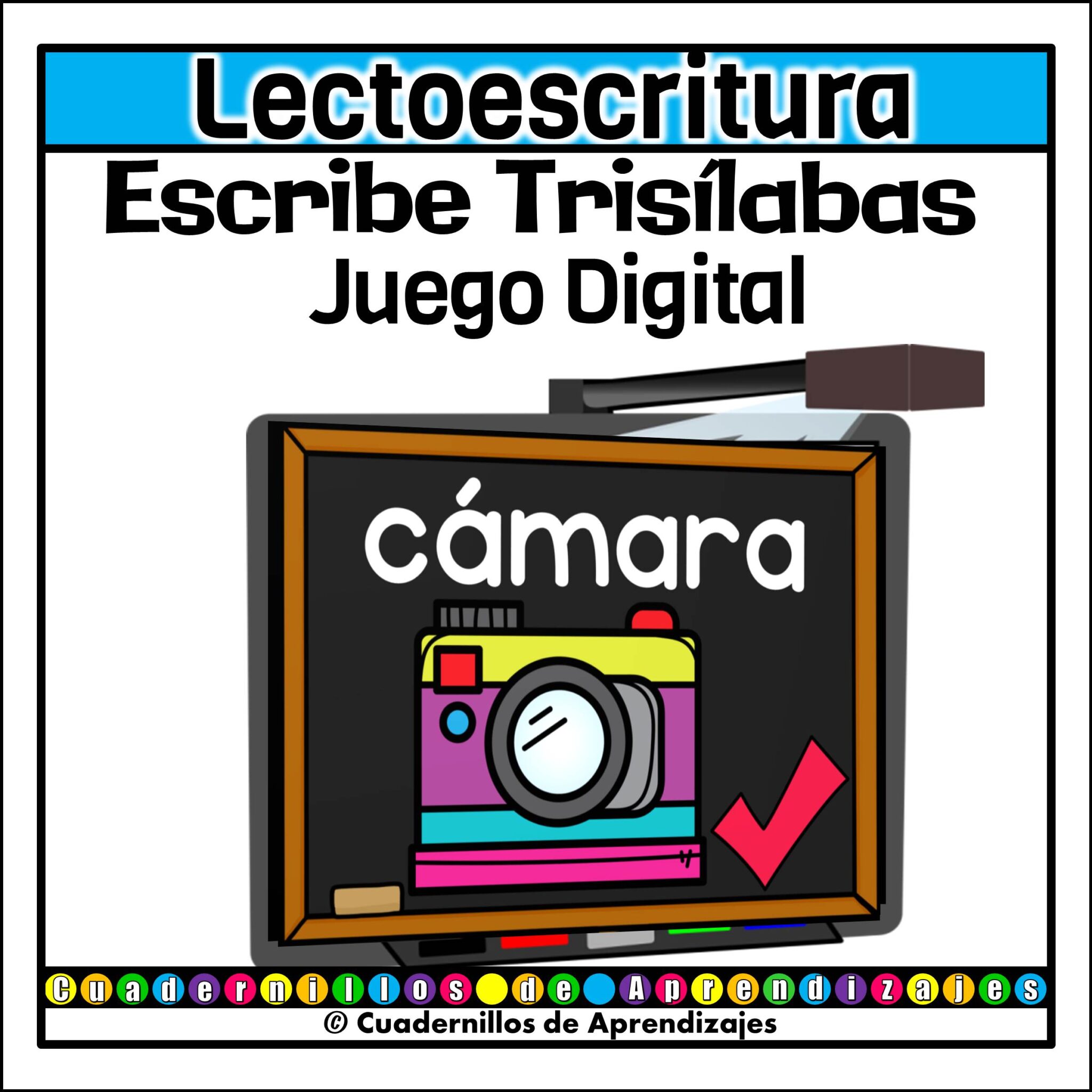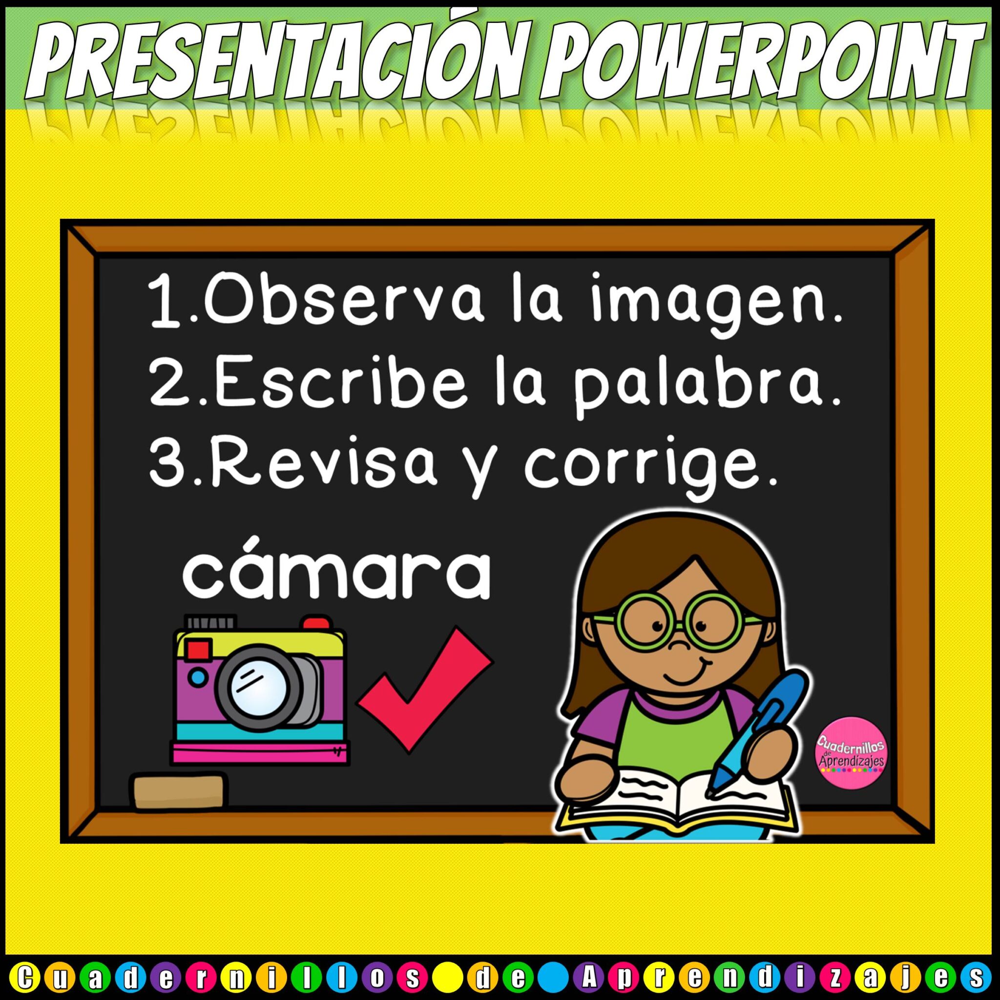 Juego Palabras de 3 Sílabas (trisílabas) presentado con PowerPoint™ para practicar lectoescritura. En este juego, los peques observan imágenes de palabras bisílabas. Escriben la palabra y luego revisan lo escrito.