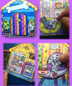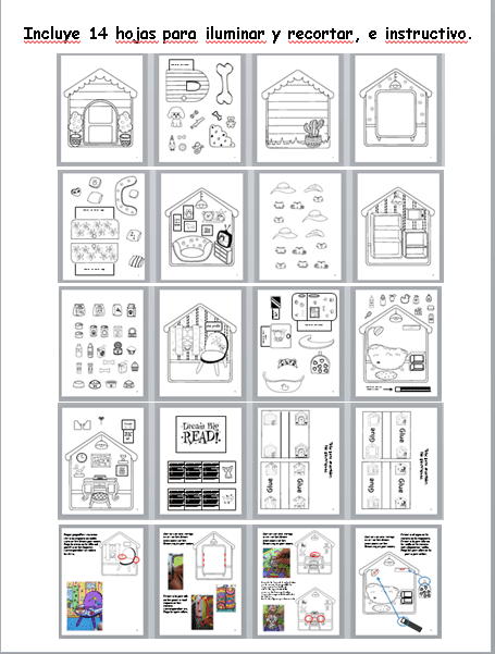 - 14 hojas para iluminar y recortar. (frente y parte trasera de la casa, cocina, comedor, habitación, guarda ropa, baño, estudio u oficina, ropa, comida, juguetes, objetos para el baño, objetos para la oficina).