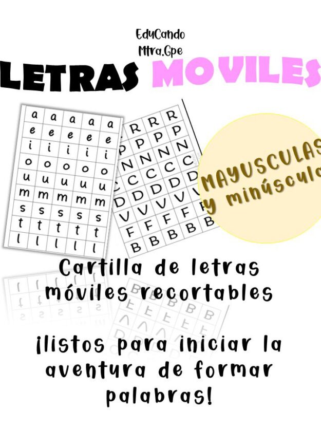 Cartilla con letras recortables en mayúsculas y minúsculas para formar palabras, con el título "Letras Móviles" en grande y un texto que invita a recortar y usar las letras.