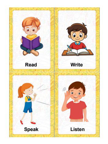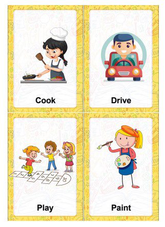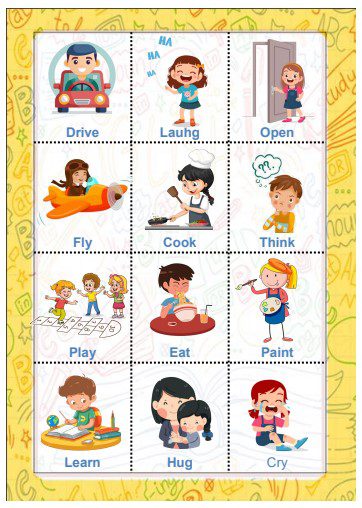 Tableros con imágenes claras y verbos en inglés.
