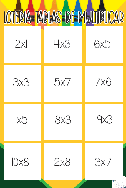 Una colorida tarjeta educativa de Lotería Tablas de multiplicar temática crayolas muestra tablas de multiplicar, con números del 2x3 al 9x5, cada uno dentro de una cuadrícula separada. Las instrucciones se proporcionan en español en el lado izquierdo con un diseño floral decorativo.