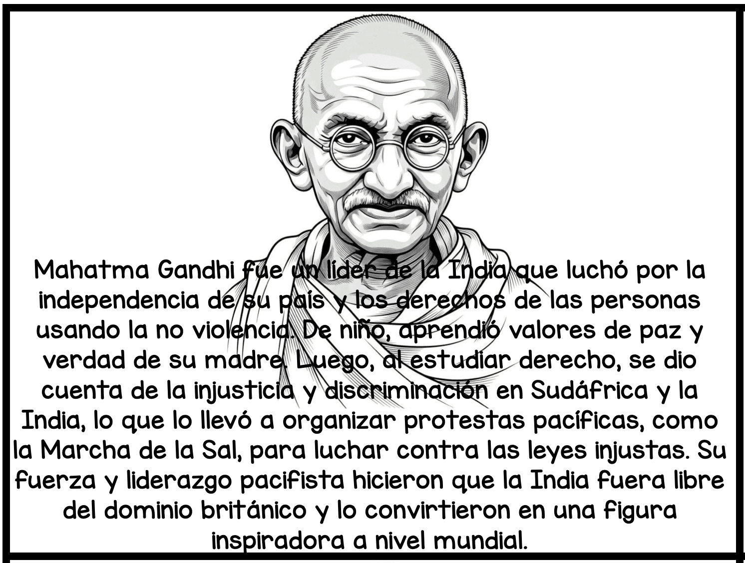 Pequeño texto para trabajar en la historia de Mahatma Gandhi en el margen de la celebración del dia de la no violencia. listo para imprimir 4 por hoja en tamaño carta