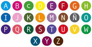 La imagen muestra las letras del alfabeto español, incluida la letra "Ñ", cada una dentro de un círculo de color. Los círculos están organizados en orden alfabético de la A a la Z. Cada círculo es de un color diferente, creando un Muestreos para Primero de primaria vibrante y colorido de tonos.