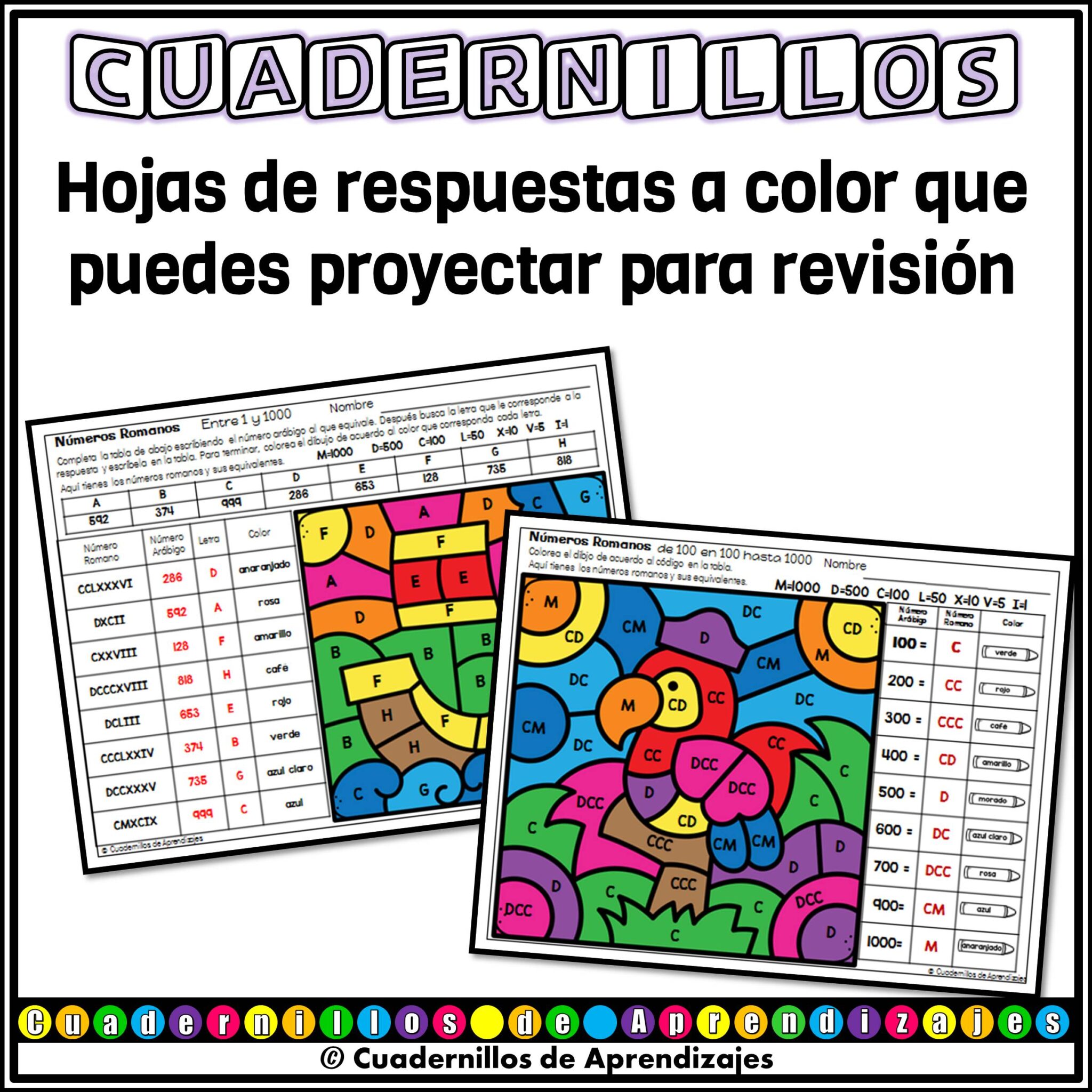 Las hojas de respuestas a color las puedes imprimir para referencia o puedes usar proyector o computadora para que los estudiantes se revisen solos.