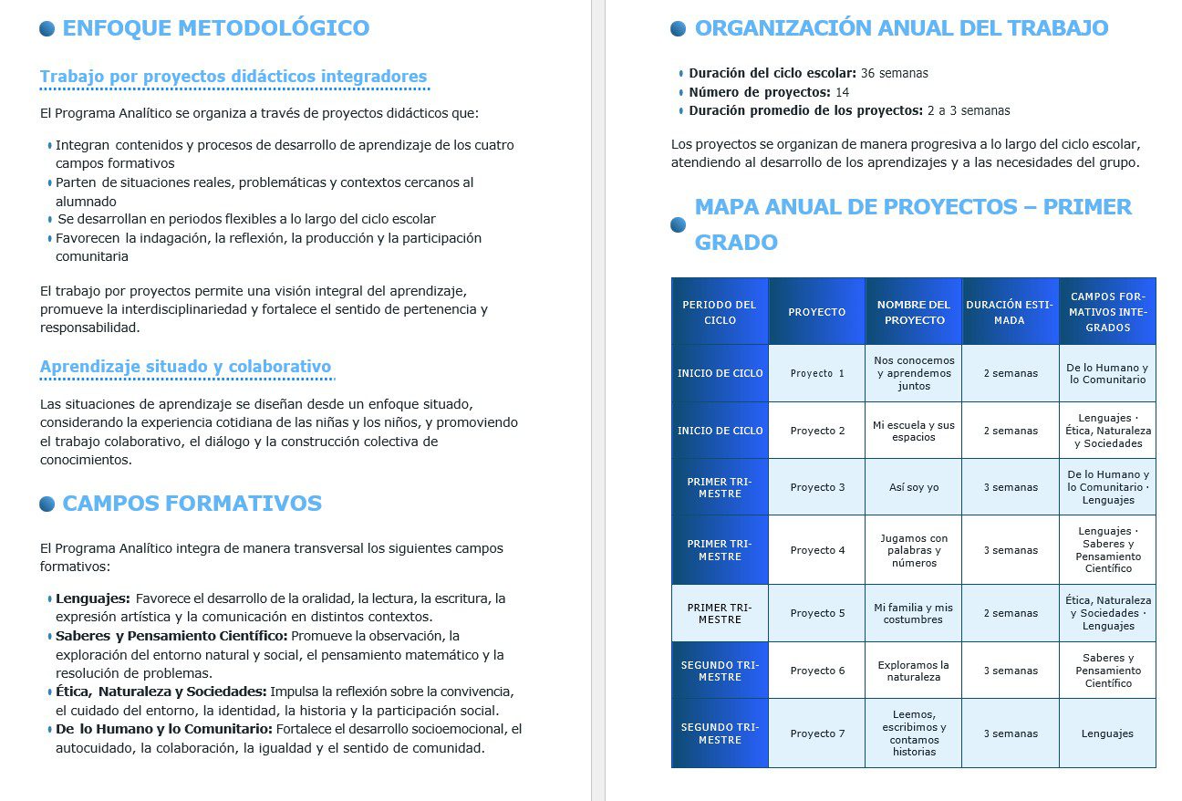 El contenido está organizado para cubrir las 36 semanas del ciclo escolar, a través de 14 proyectos didácticos integradores que articulan de manera natural los campos formativos y los procesos de desarrollo de aprendizaje establecidos en el Plan de Estudios 2022 para la Fase 3.