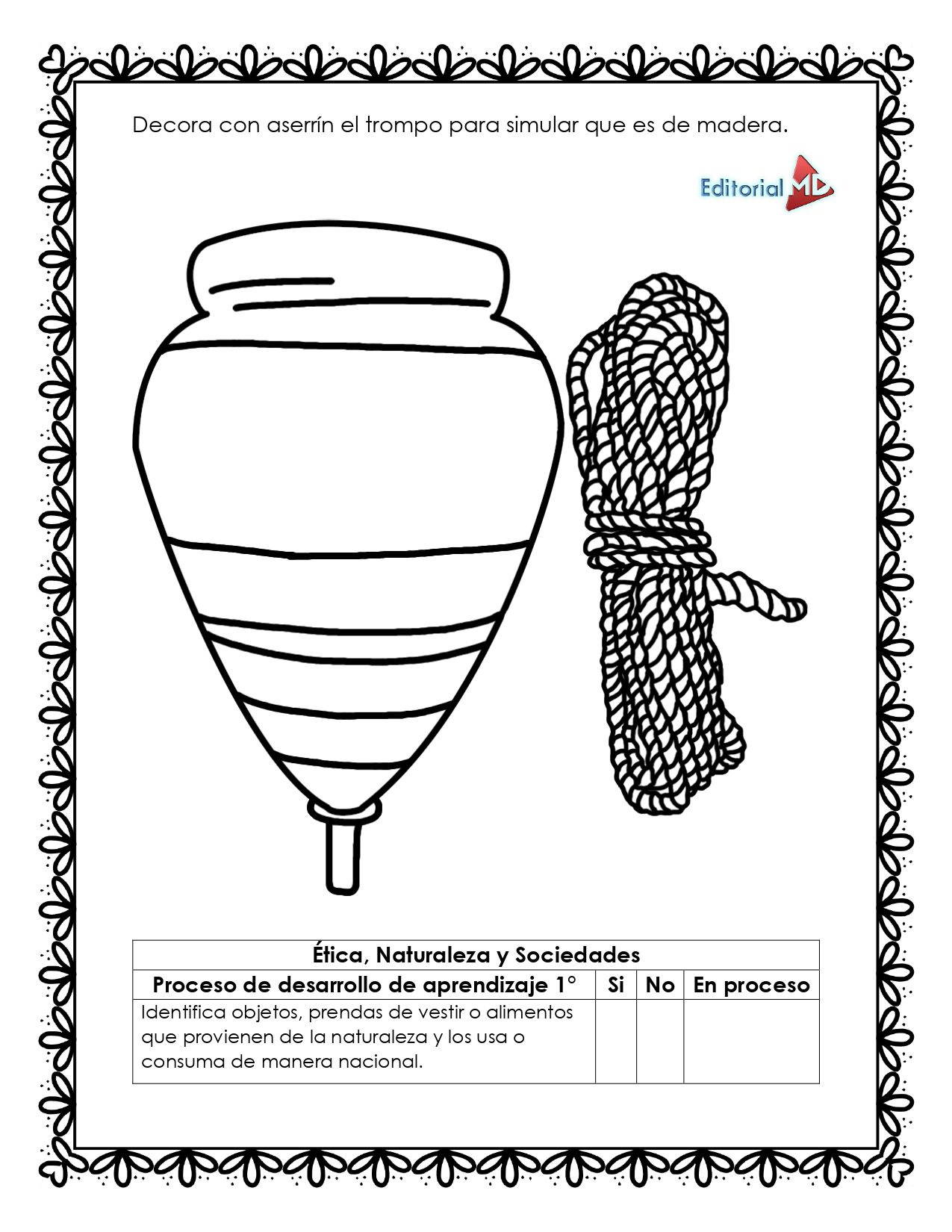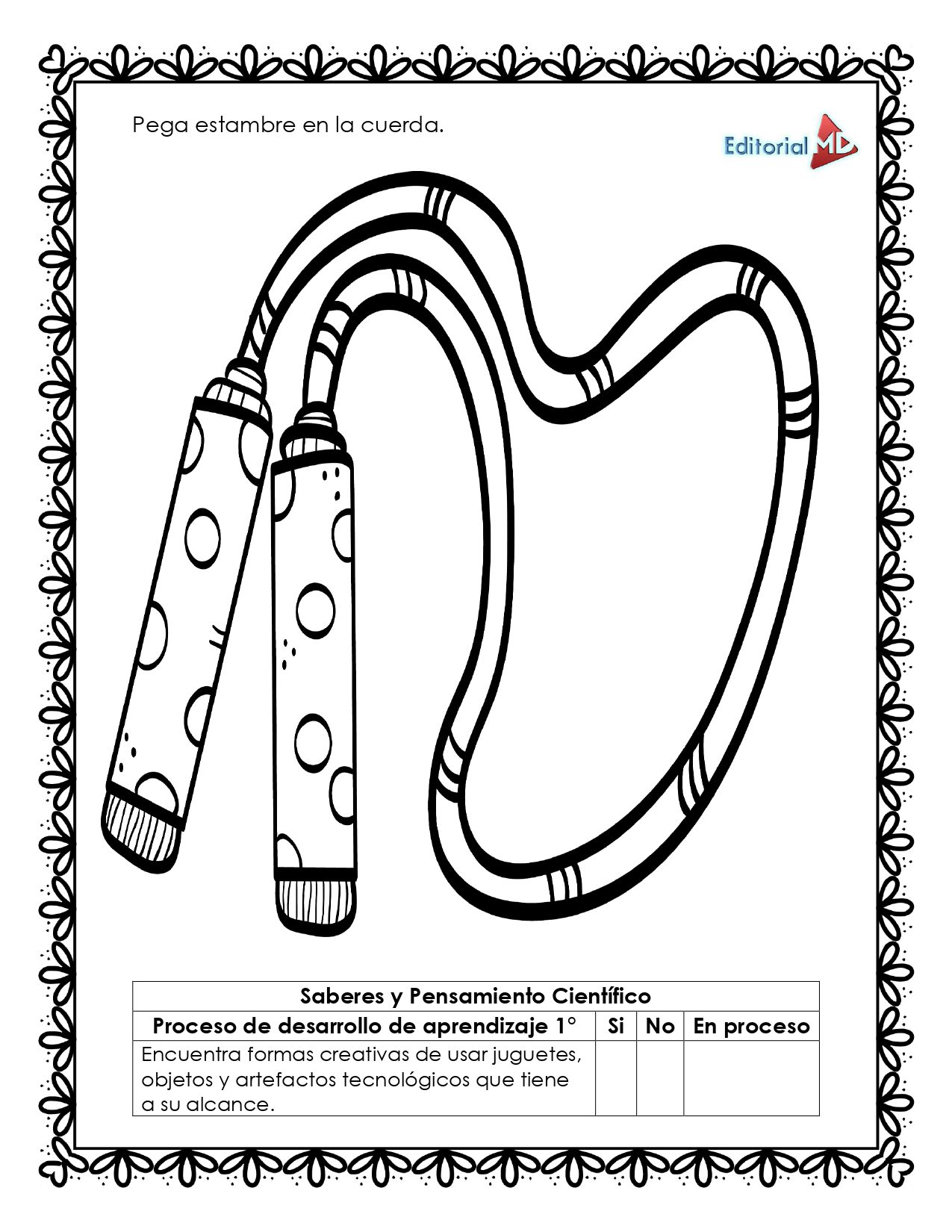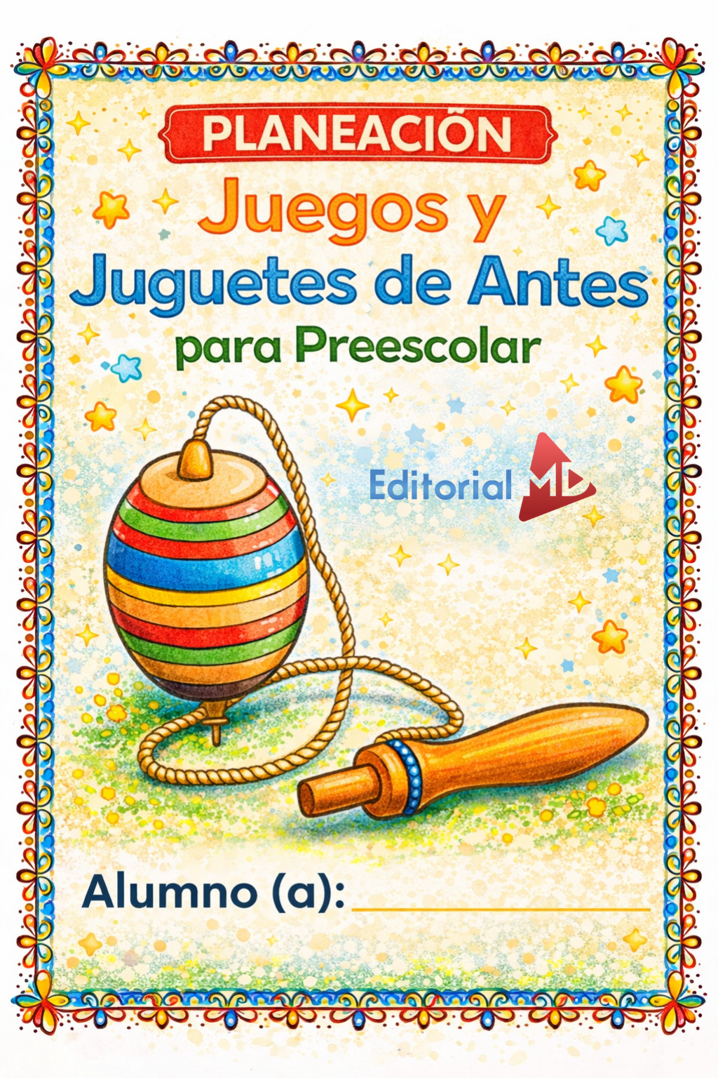 Colorida portada de un libro de actividades preescolares titulado "Planeación Juegos y Juguetes de Antes para Preescolar" con la ilustración de una peonza y una cuerda. El logotipo de Editorial MD aparece en el lado derecho.