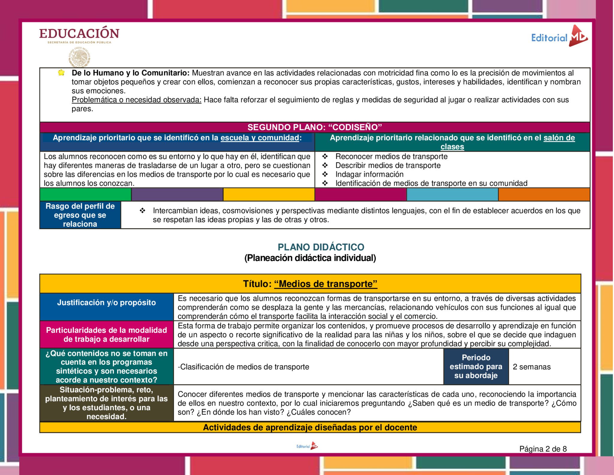 El Plano Didáctico “Medios de transporte” es una planeación educativa completa diseñada para , con una duración de dos semanas alineada al Plan de Estudios de la Nueva Escuela Mexicana, y desarrollada bajo la modalidad de Unidad Didáctica.