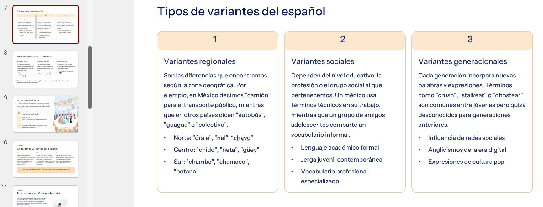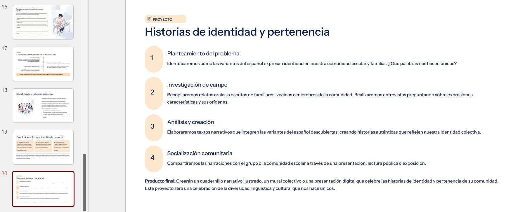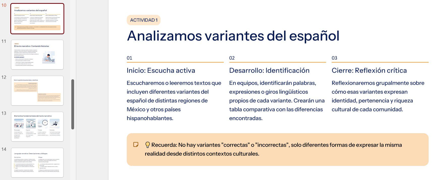 Este material incluye 14 presentaciones digitales, una por cada contenido oficial del programa sintético de Español para segundo grado de secundaria. Cada presentación está compuesta por 20 diapositivas, lo que da un total de 280 diapositivas, estructuradas para desarrollar de manera clara y progresiva los Procesos de Desarrollo de Aprendizaje.