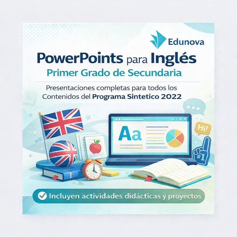 Colección completa de 14 presentaciones, alineadas al Programa Sintético 2022 de la Nueva Escuela Mexicana. Incluye 20 diapositivas por cada contenido (280 diapositivas en total), con actividades didácticas y proyectos, diseñadas para iniciar al alumnado en el nivel A1 de inglés, listas para usarse en el aula.