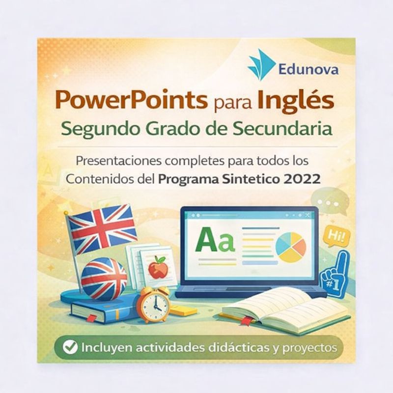 Imagen promocional de "PowerPoints para Inglés Segundo Grado de Secundaria" de Edunova, con material escolar, banderas británica y estadounidense, y texto sobre presentaciones y actividades educativas para el programa de 2022.