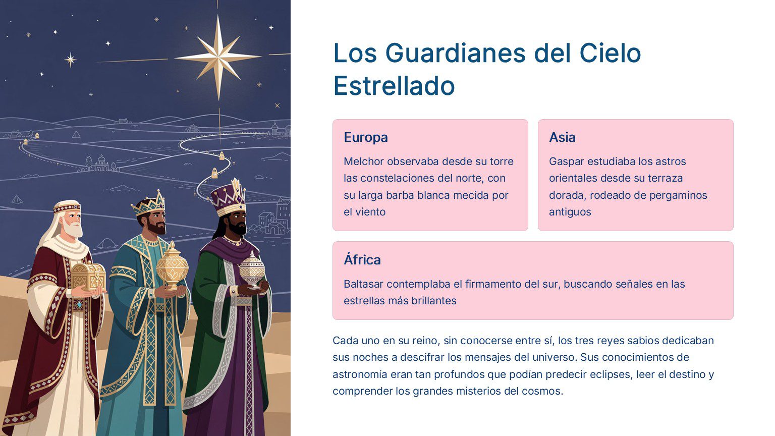 Una estrella brillante aparece en el cielo y guía a los tres reyes hacia un destino misterioso.