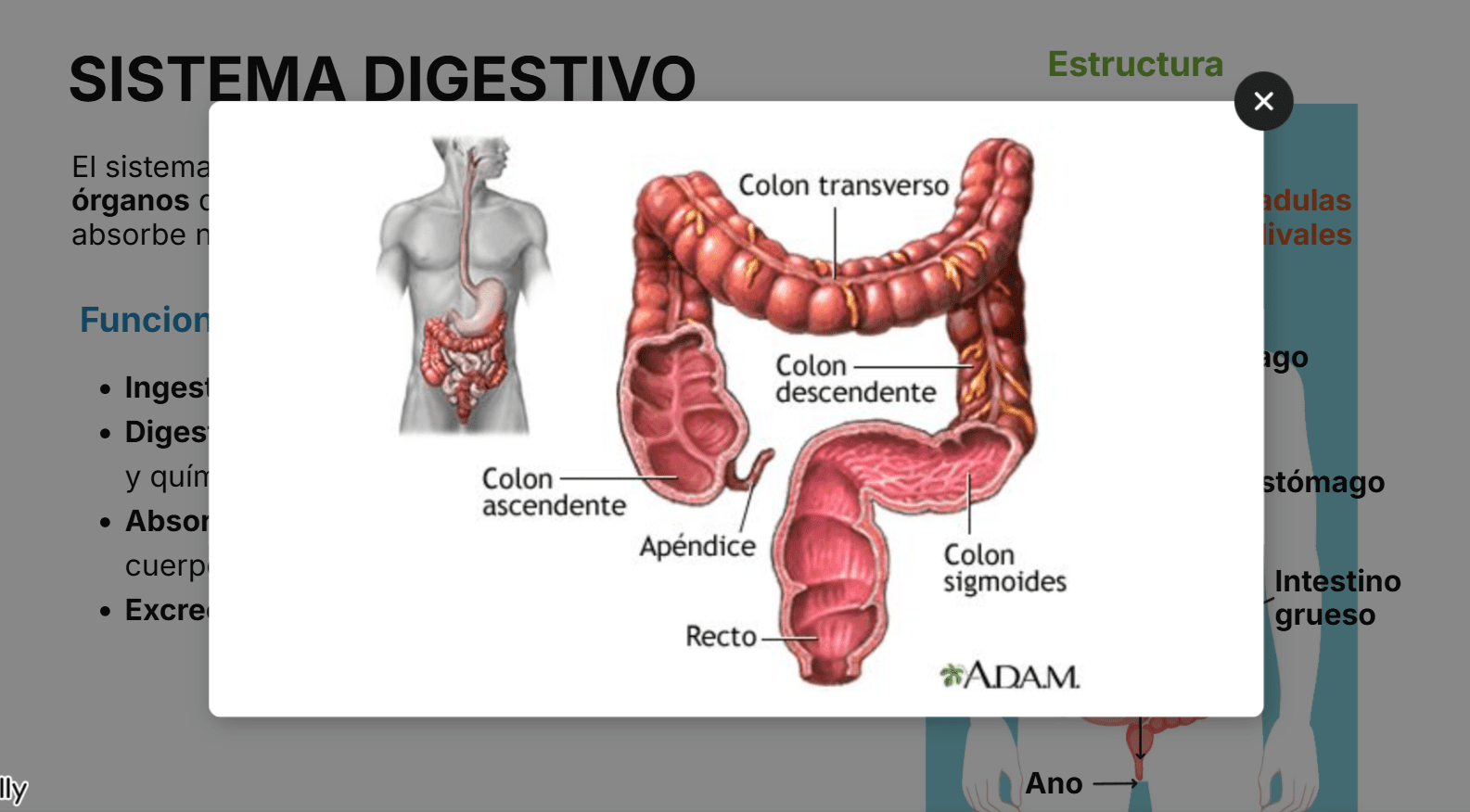 Este recurso didáctico ofrece una presentación interactiva sobre el sistema digestivo humano, diseñada para facilitar la comprensión de sus funciones y órganos principales. A través de imágenes y explicaciones concisas, los estudiantes exploran las etapas del proceso digestivo: desde la ingestión del alimento, su transformación mecánica y química en el estómago, la absorción de nutrientes en el intestino delgado, hasta la excreción de residuos por el intestino grueso y el ano.