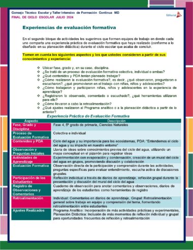 Ejemplo de experiencia práctica de evaluación formativa considerando los siguientes aspectos a partir de sus conocimientos y experiencia: