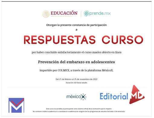 Respuestas del curso en línea sobre la Prevención del embarazo en adolescentes, dirigido a docentes y talleristas de los centros educativos de de México, así como a madres, padres de familia tutores y adolescentes.