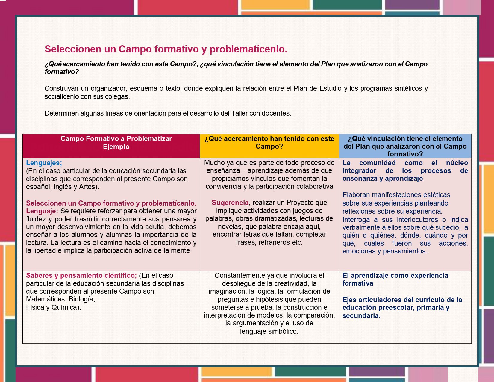 Cuadro con Selección de un Campo formativo y problematizado. ¿Qué acercamiento han tenido con este Campo?, ¿Qué vinculación tiene el elemento del Plan que analizaron con el Campo formativo? (Incluye todas las respuestas y una tabla con el ejemplo de la Problematización)