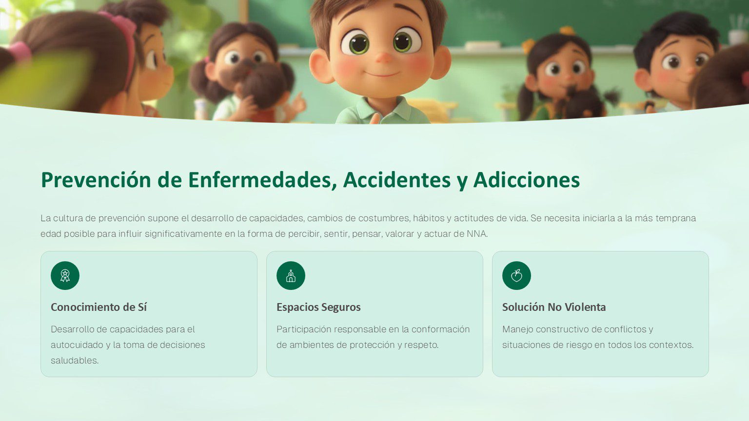 - Corresponsabilidad escuela–familia–comunidad como base del bienestar integral.