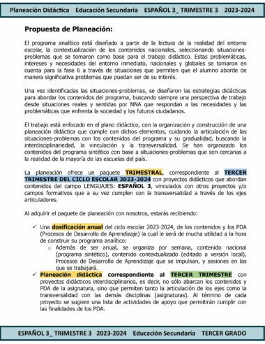 Visitar el siguiente enlace para adquirir la planeación ANUAL-COMPLETA de esta asignatura, ESPAÑOL 3: https://www.editorialmd.com/ver/programa-analitico-anual-espanol-3
